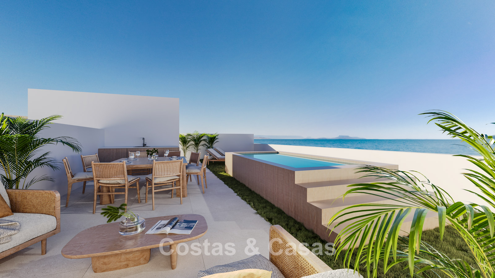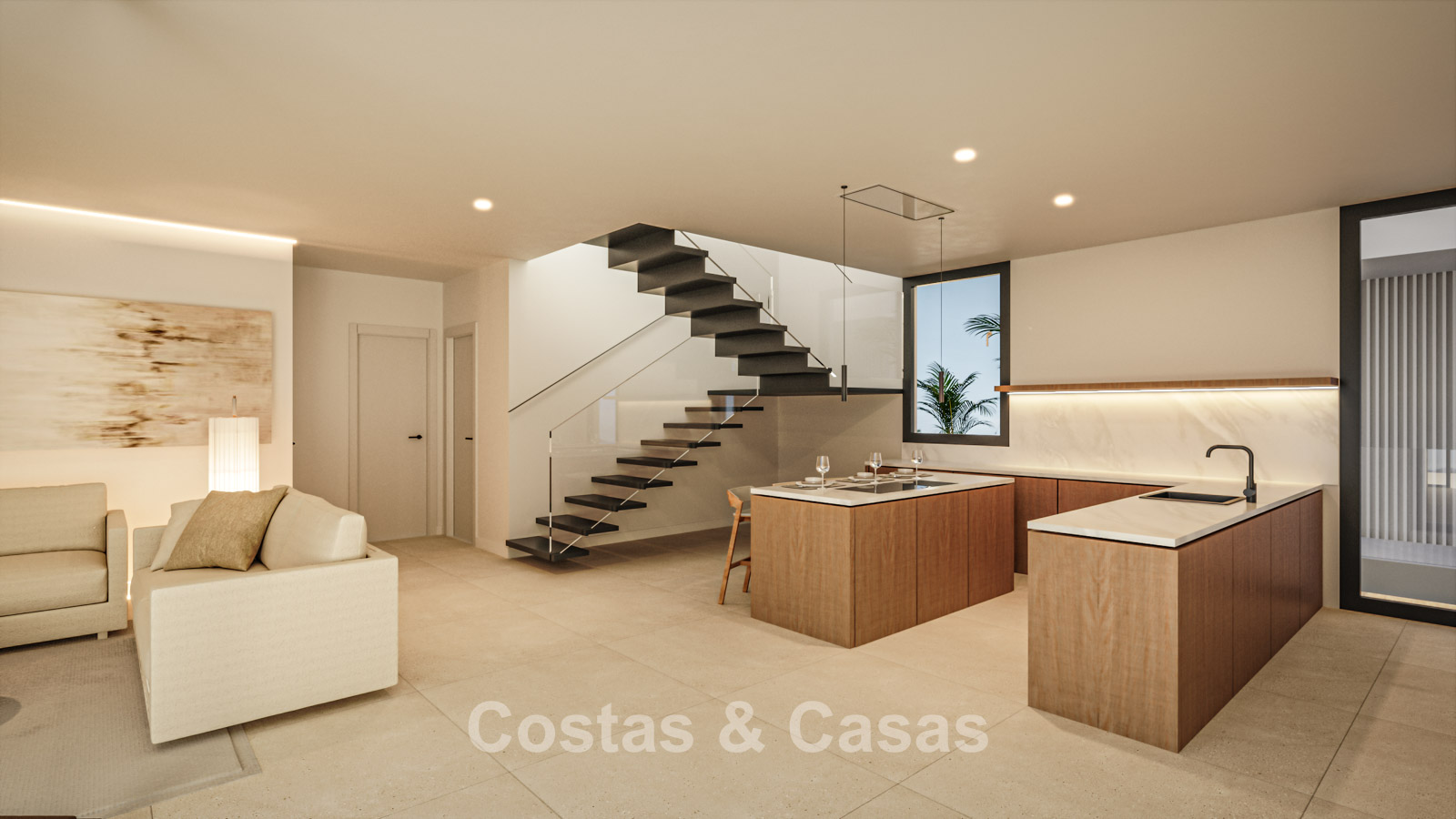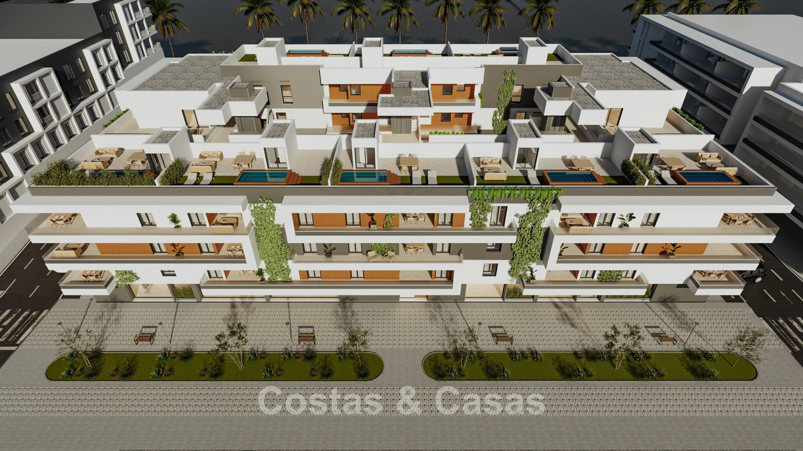 Appartements neufs à l’architecture avant-gardiste. Matériaux haut de gamme et finitions raffinées. Les penthouses bénéficient d’une spacieuse terrasse sur le toit avec piscine privée. Des terrasses accueillantes offrent un espace détente. De hautes baies vitrées coulissantes avec profilés encastrés dans le séjour laissent entrer la lumière naturelle. Mobilier contemporain et espace ouvert. Cuisines allemandes entièrement équipées avec îlot central. 2 ou 3 chambres, 2 salles de bain. Débarras. Garage privé intérieur.