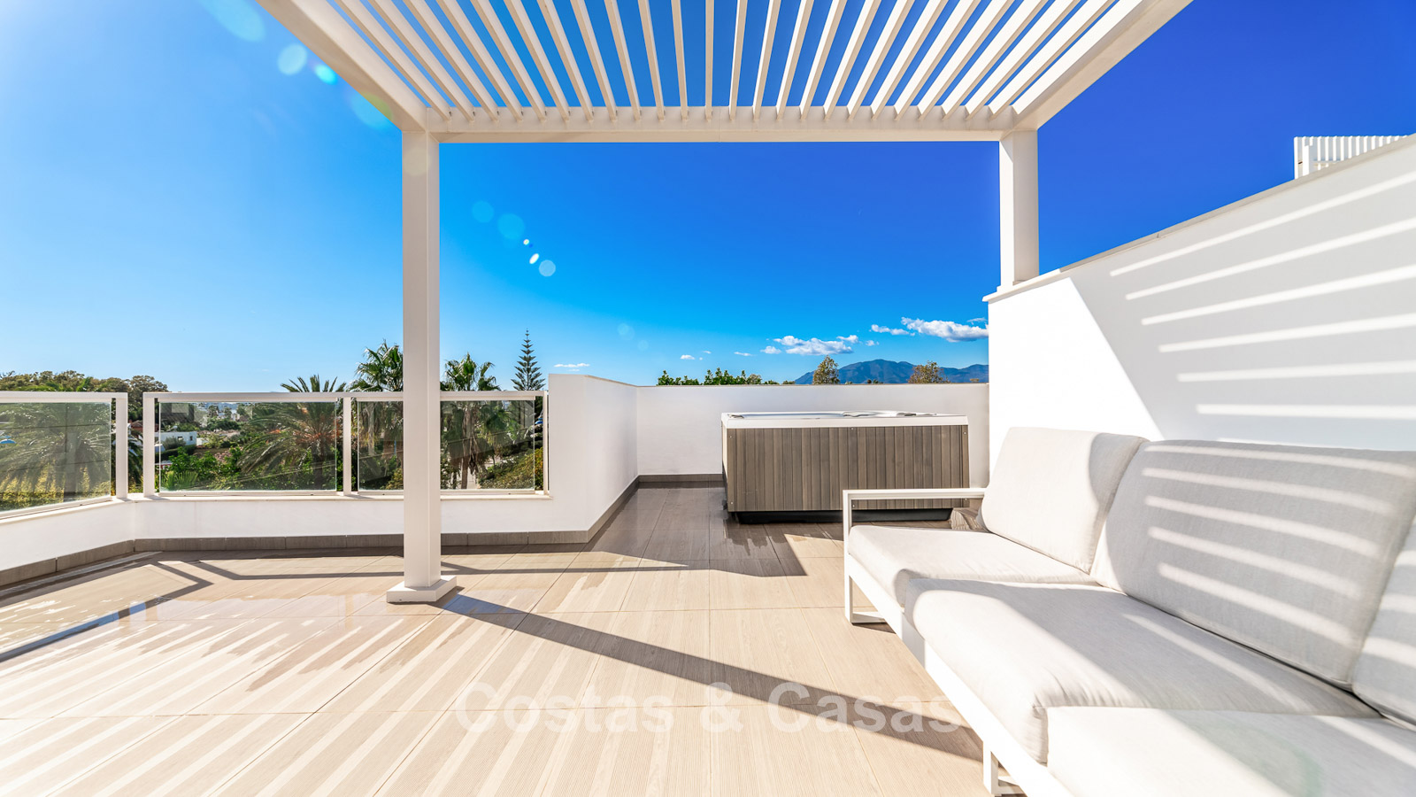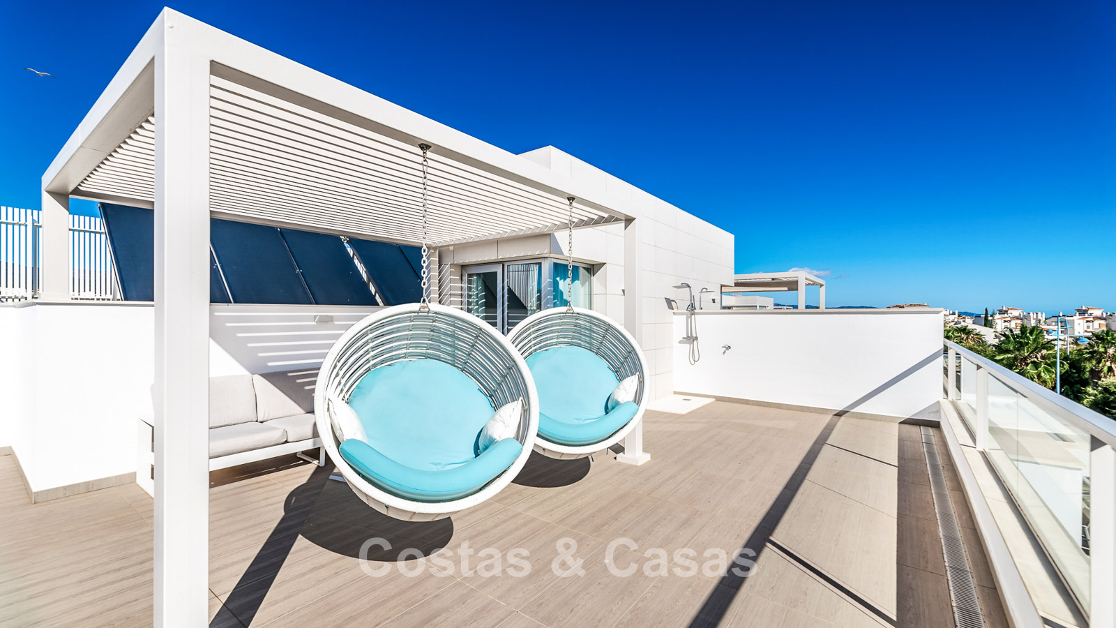 Penthouse moderne dans un complexe récemment construit. Orienté sud-ouest. Cuisine pratique et entièrement équipée avec buanderie adjacente. Espace de vie avec salle à manger et salon. Terrasse spacieuse attenante au salon. Solarium équipé d'un chillout et d'un jacuzzi. Vue dégagée sur les environs, le paysage montagneux et la mer Méditerranée. De grandes fenêtres apportent de la lumière. 3 chambres à coucher, 2 salles de bains. Débarras + garage intérieur pour 2 voitures.