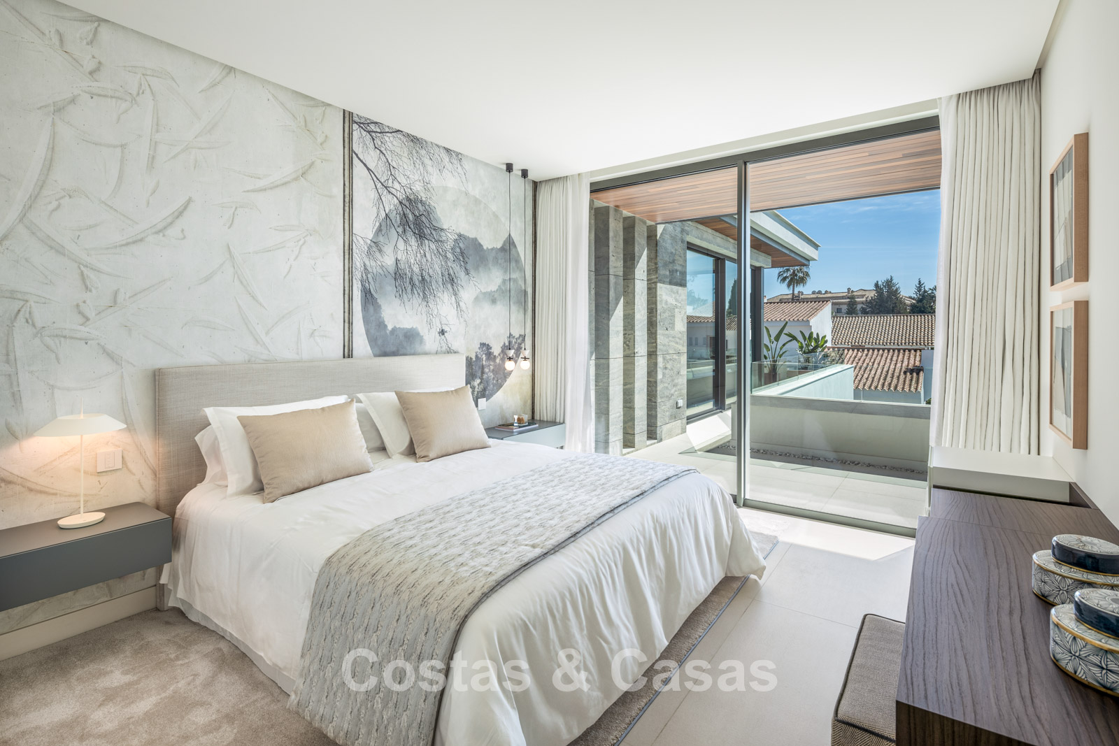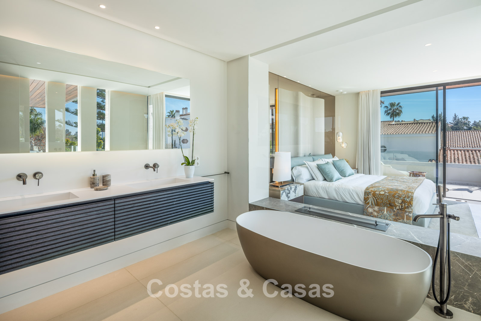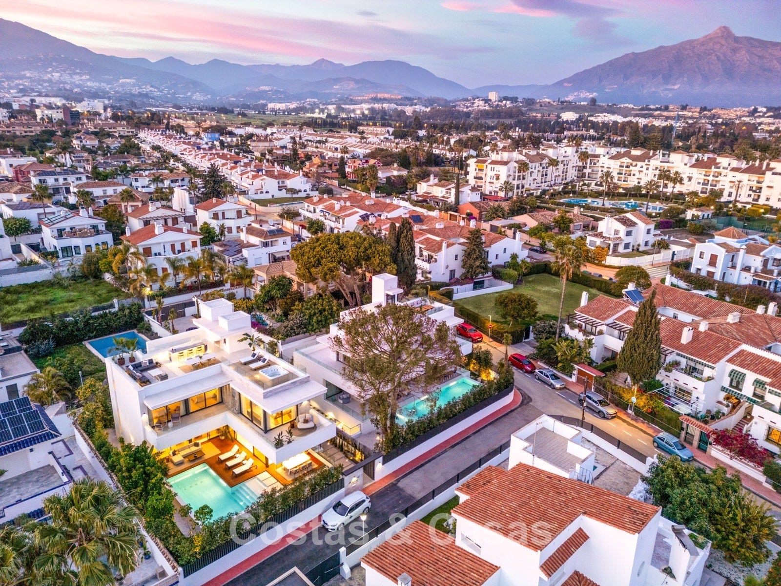 Nouvelle villa. Conçu avec des matériaux de haute qualité et un souci de finition raffinée. Un intérieur moderne et élégant. Entrée couverte. Toilette pour invités. Disposition ouverte. Salon ouvert avec cheminée moderne et accès direct à la terrasse couverte. Salle à manger. Vues sur le jardin et sur la piscine. Cuisine ouverte avec îlot de cuisson où vous pouvez vous asseoir. Salle de stockage. Des fenêtres coulissantes à hauteur de pièce, avec des profils en retrait, qui assurent une liaison parfaite entre l'intérieur et l'extérieur. 5 chambres à coucher et 5 salles de bain. Grande chambre principale en-suite avec dressing de presque 7m² et accès à la terrasse couverte. 2 chambre à l'étage inferieure dont 1 en-suite. Également à l'étage inférieur, un espace de détente avec salon TV. Locaux techniques, salle de stockage et buanderie. Parking pour 4 voitures.