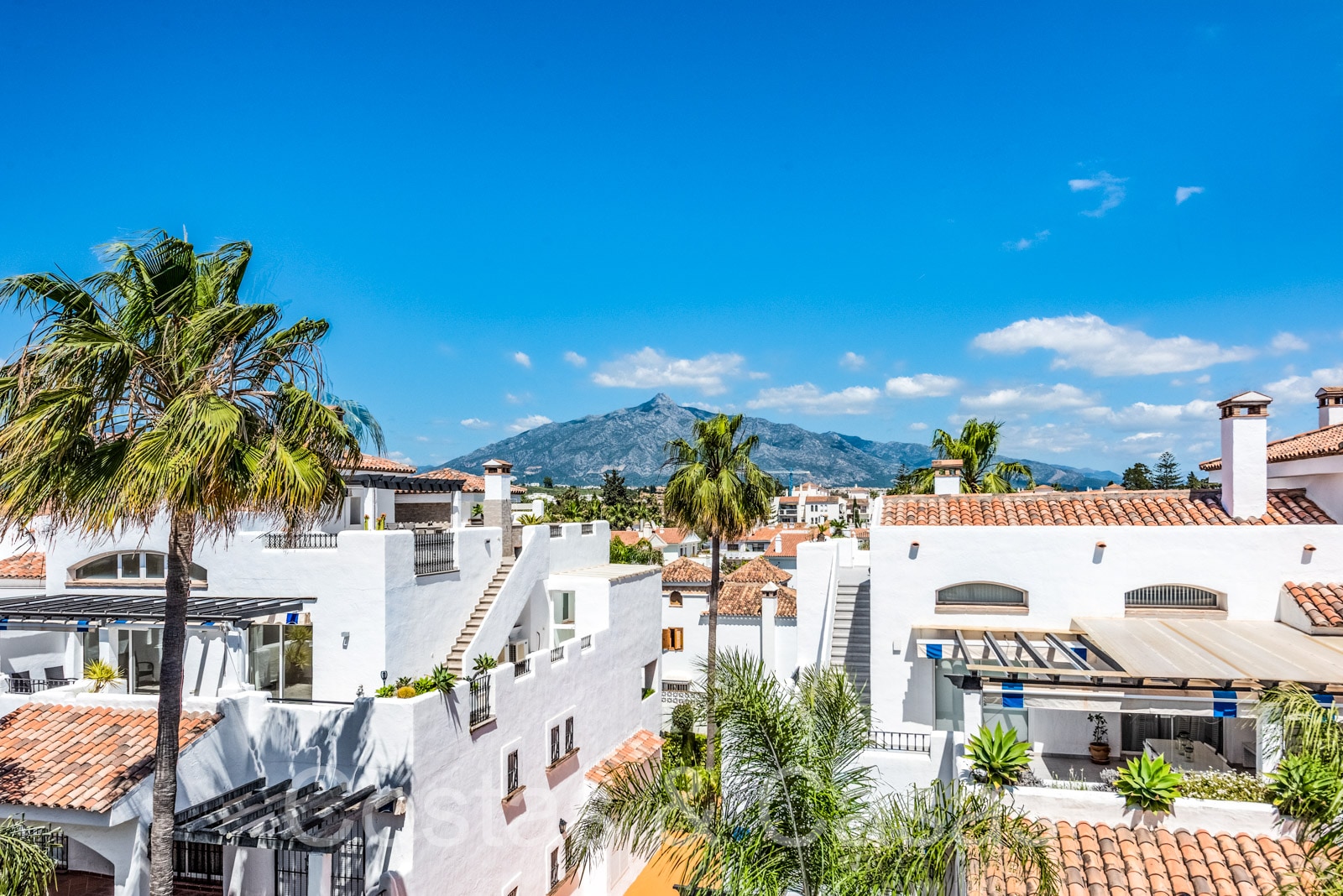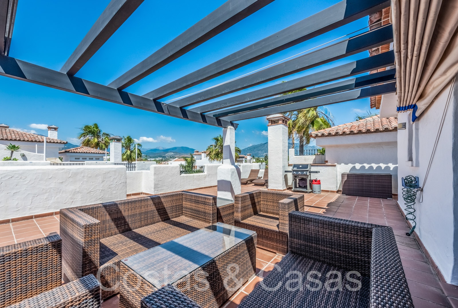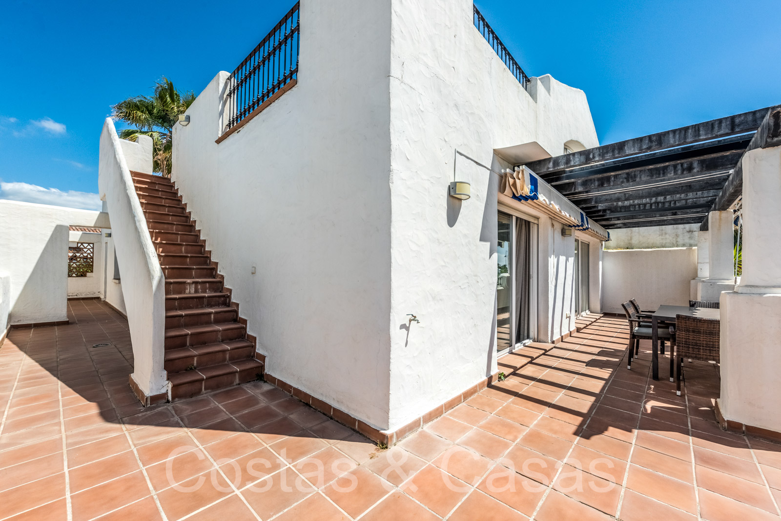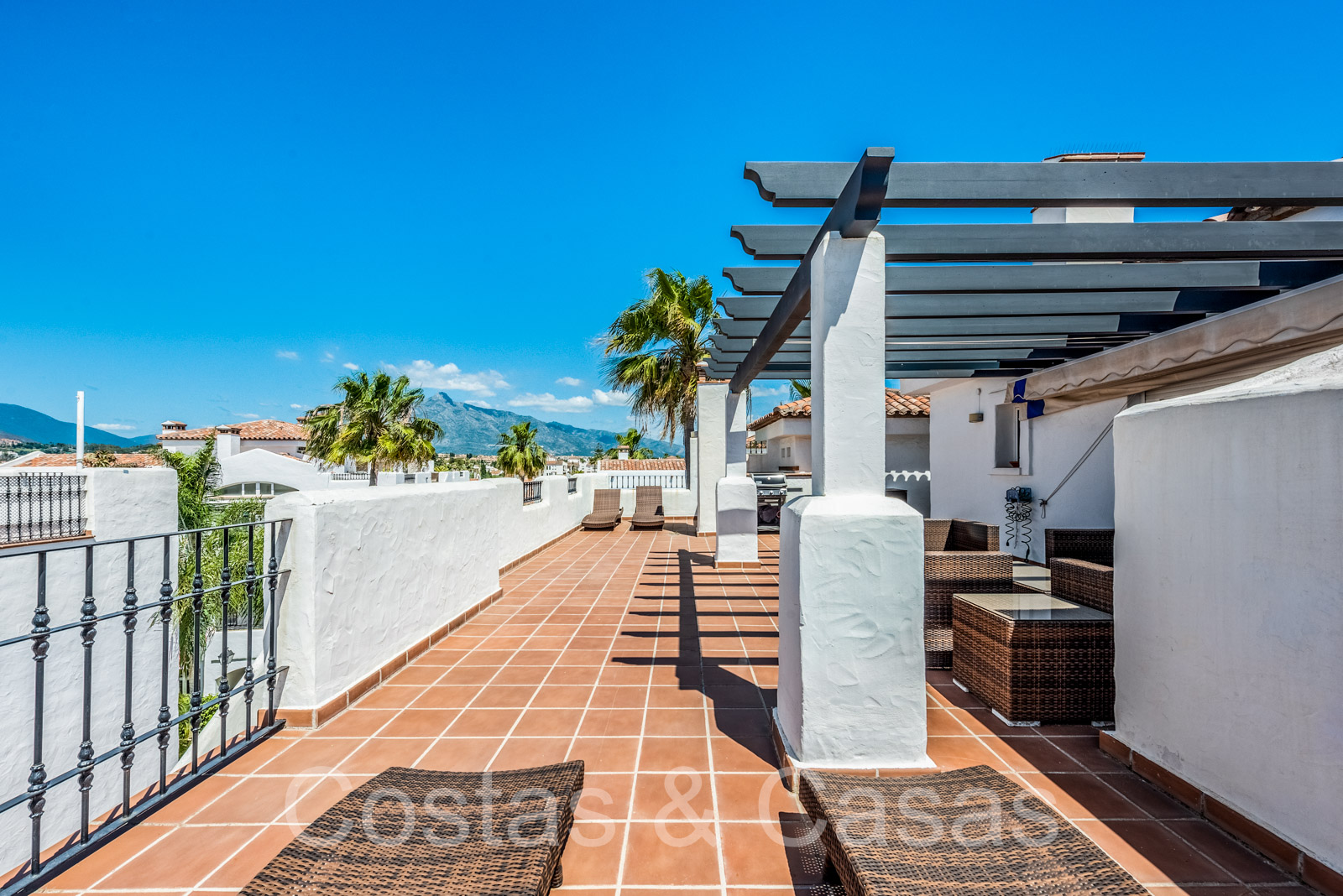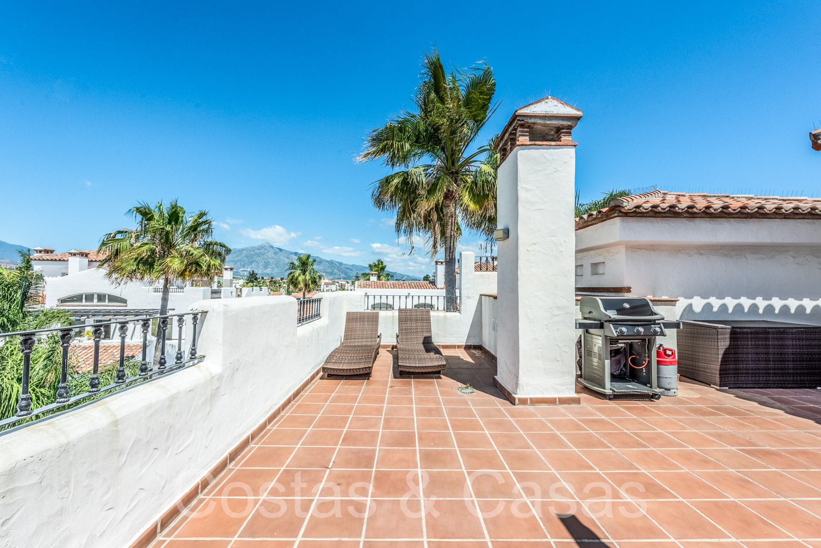 Penthouse en duplex spacieux dans un complexe fermé construit avec une architecture andalouse. Utiliser des matériaux de qualité. Face à l'ouest. Terrasse pergola adjacente, qui peut être couverte par un auvent si on le souhaite. Un escalier extérieur monte à un vaste solarium, équipé d'un salon et d'un espace barbecue. Depuis le solarium, vous pourrez profiter d'une vue panoramique sur les environs, sur le sommet de La Concha et sur la mer Méditerranée. Salon spacieux avec un plafond partiellement à double hauteur, qui offre une luminosité abondante. Coin repas intégré. Cuisine séparée entièrement équipée avec coin repas et buanderie adjacente. 2 chambres, 2 salles de bains. Sols en marbre. Débarras. Parking souterrain double inclus.