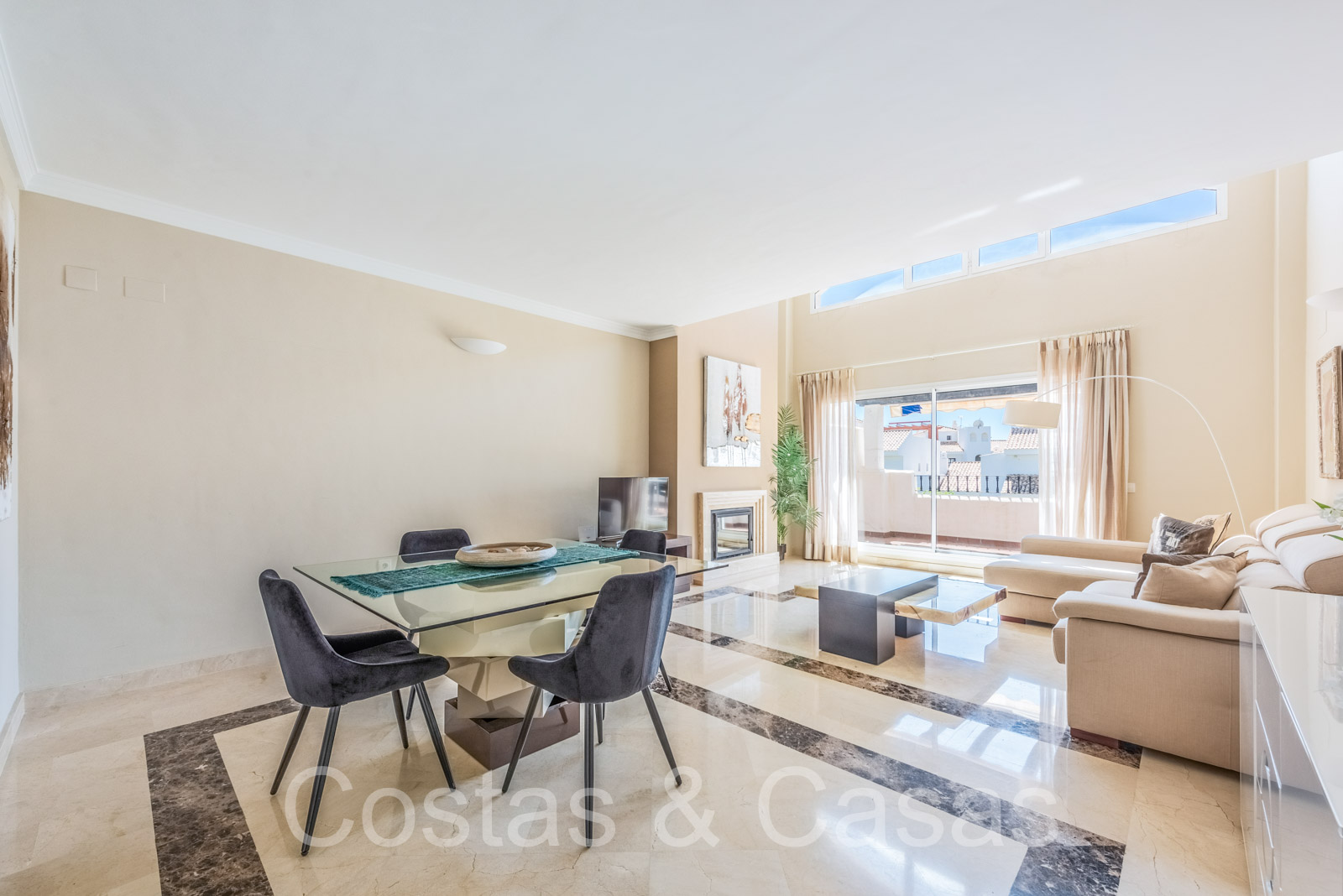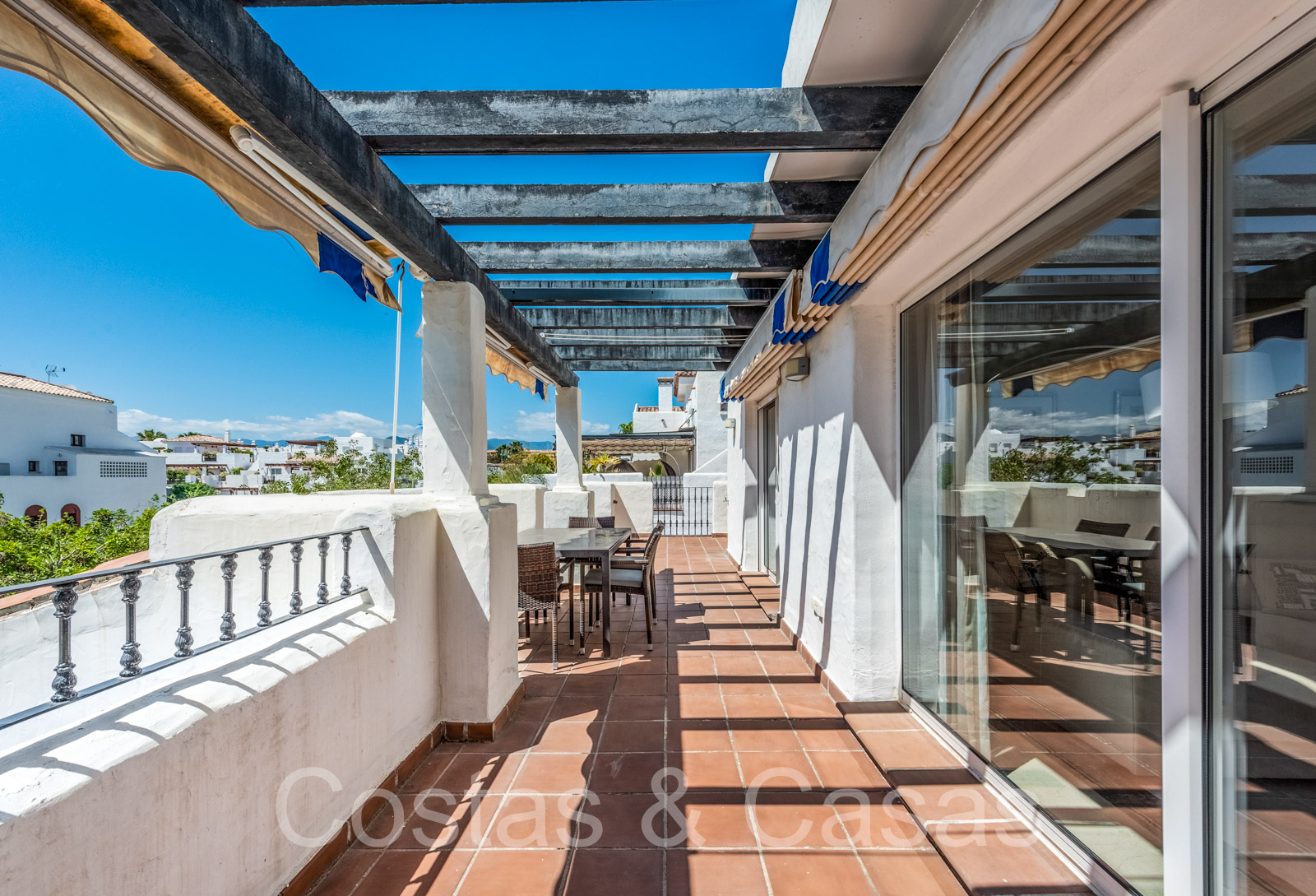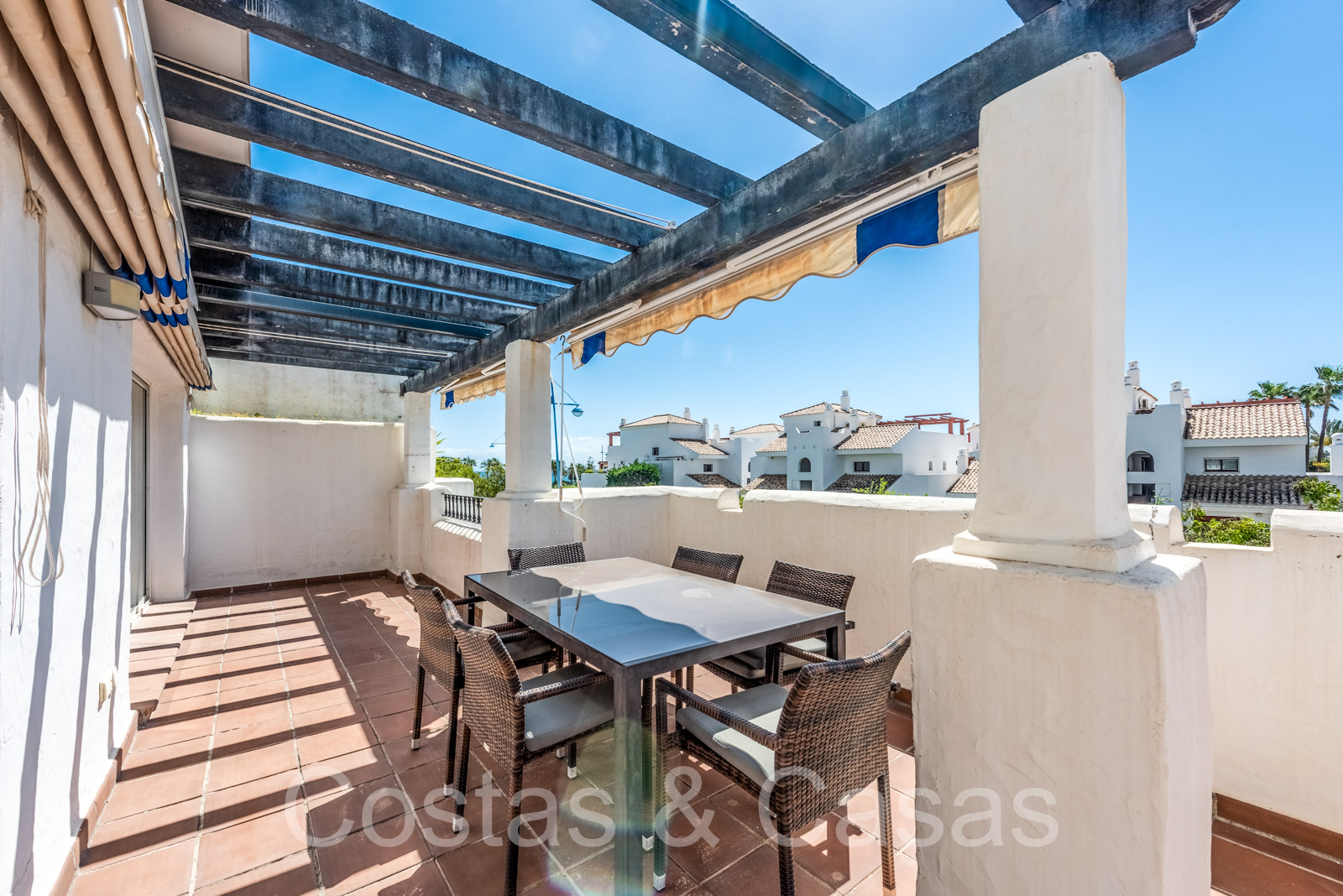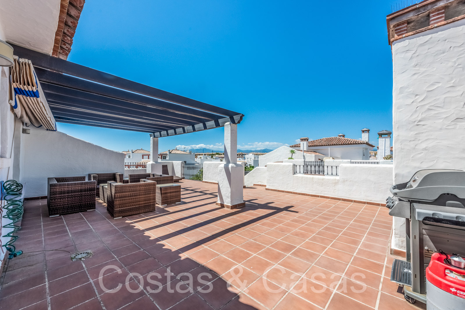 Penthouse en duplex spacieux dans un complexe fermé construit avec une architecture andalouse. Utiliser des matériaux de qualité. Face à l'ouest. Terrasse pergola adjacente, qui peut être couverte par un auvent si on le souhaite. Un escalier extérieur monte à un vaste solarium, équipé d'un salon et d'un espace barbecue. Depuis le solarium, vous pourrez profiter d'une vue panoramique sur les environs, sur le sommet de La Concha et sur la mer Méditerranée. Salon spacieux avec un plafond partiellement à double hauteur, qui offre une luminosité abondante. Coin repas intégré. Cuisine séparée entièrement équipée avec coin repas et buanderie adjacente. 2 chambres, 2 salles de bains. Sols en marbre. Débarras. Parking souterrain double inclus.