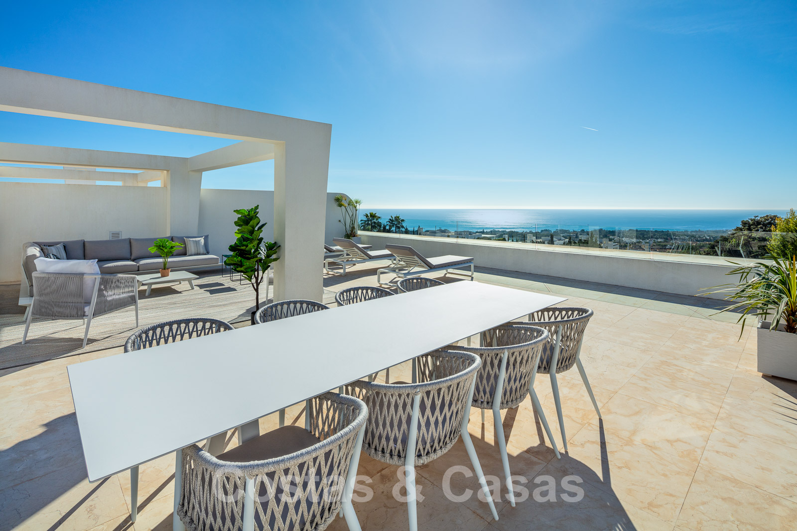 Duplex penthouse avec une pièce en plus à l'étage supérieur, une pergola attenante et un vaste solarium.