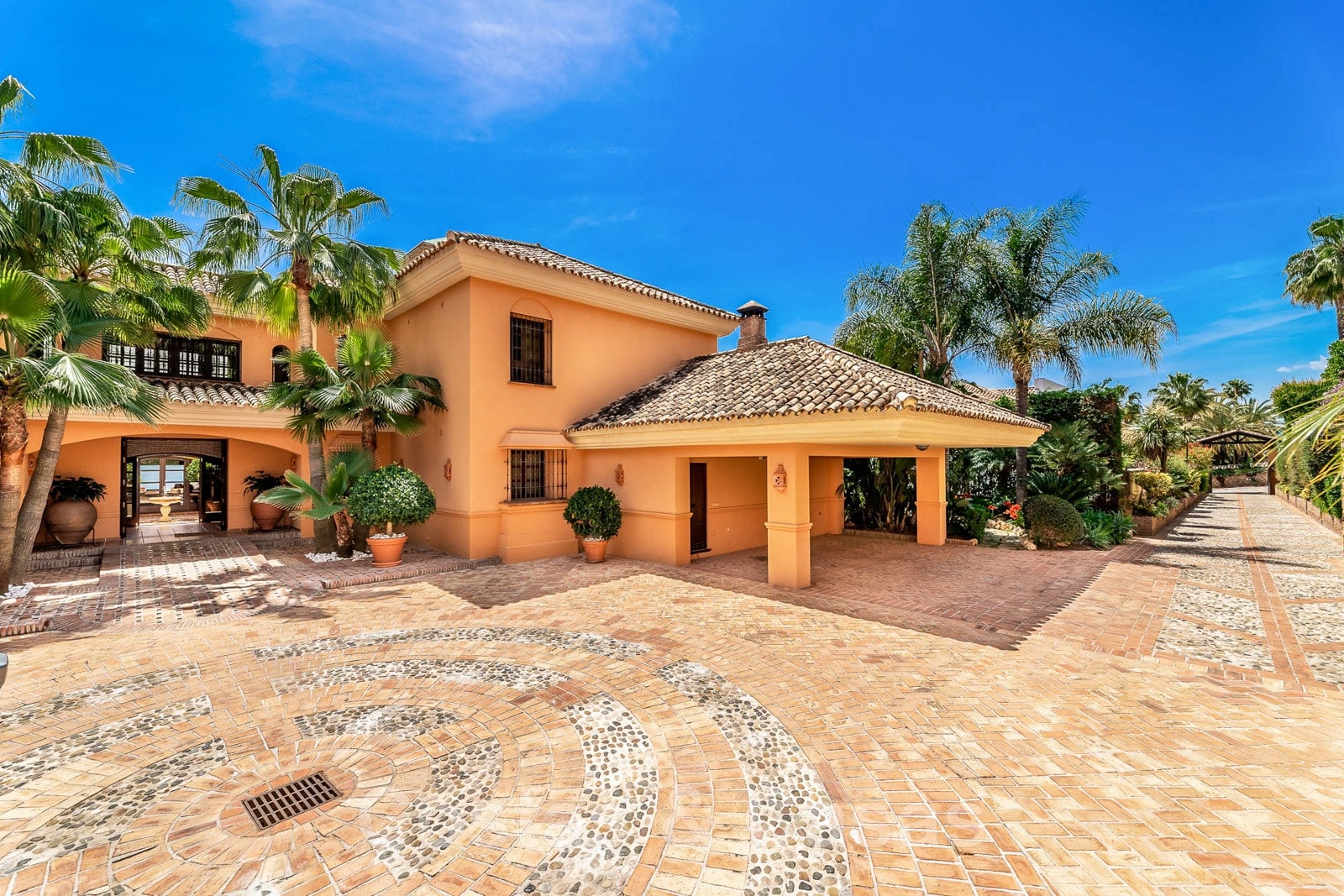 Une longue avenue donne accès à la grande allée avec parking et carport pour plusieurs voitures.