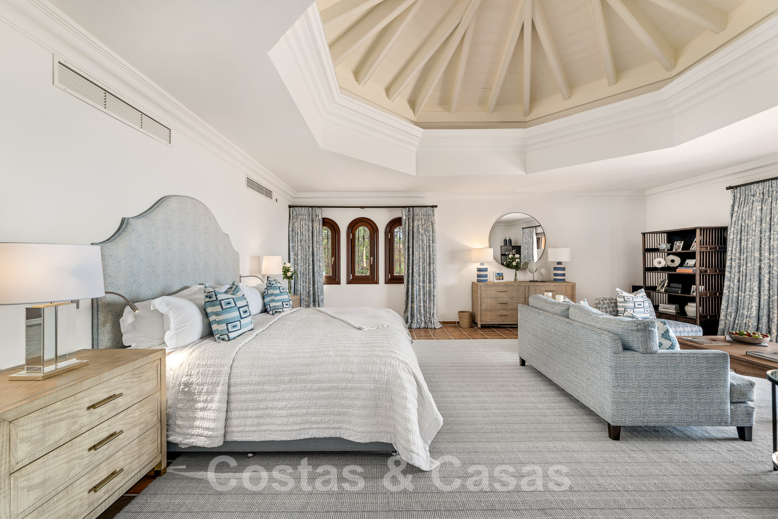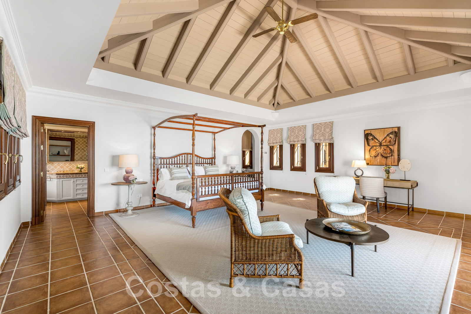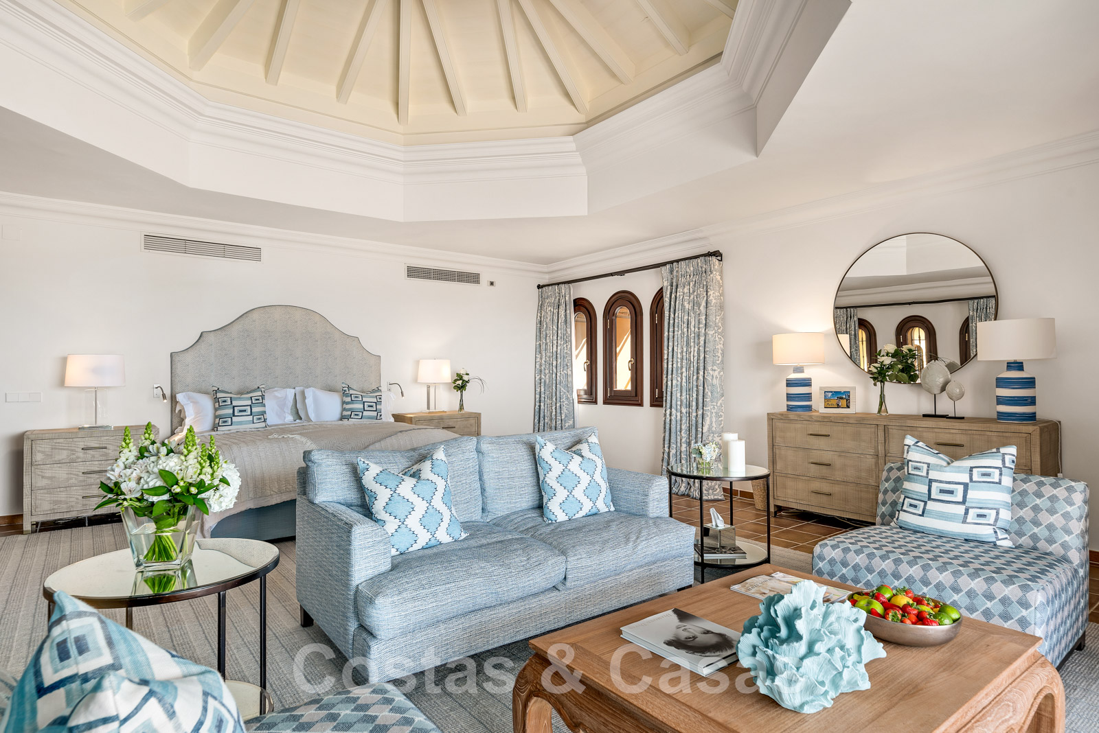 Suite principale avec double hauteur, plafond voûté, un coin salon confortable, un espace bureau, un magnifique dressing et un accès à la terrasse avec une sublime vue sur la mer.