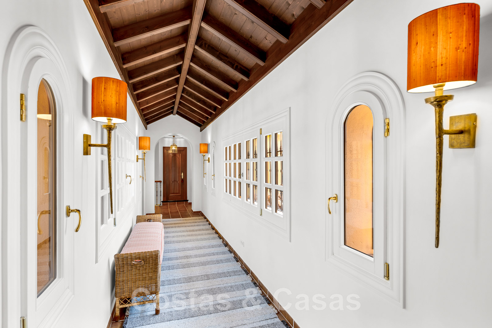 Plusieurs pièces, dont le salon, ont des plafonds hauts, voûtés avec des poutres en bois, ce qui donne une touche authentique.