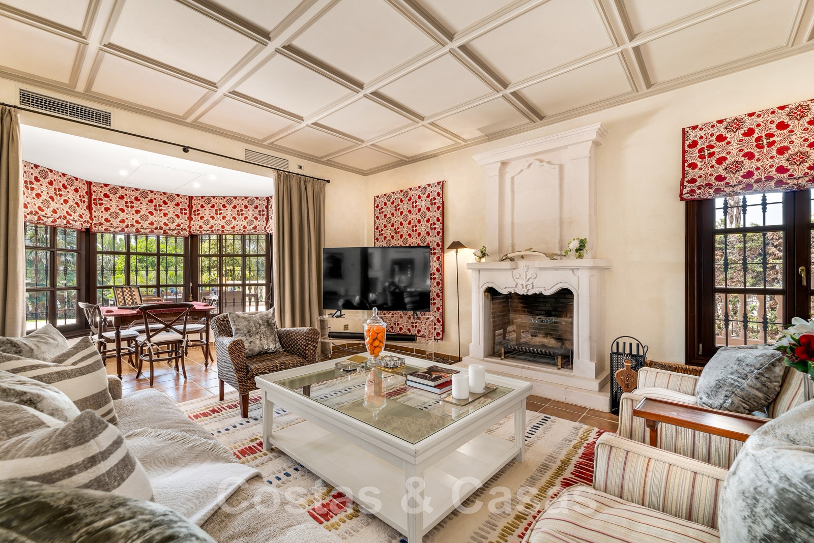 Salle de séjour avec salon, cheminée classique, 2ème salon TV et espace détente.
