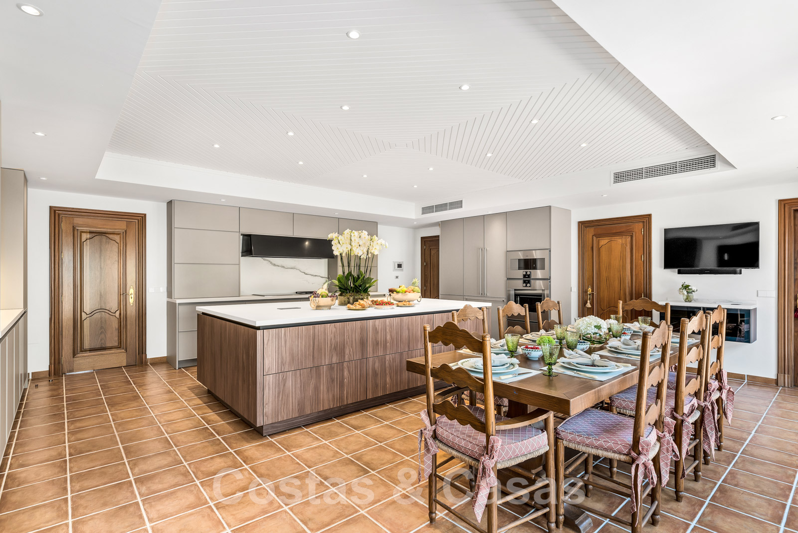 Une cuisine moderne, entièrement équipée d'appareils Gaggenau et d'un grand îlot de cuisson.