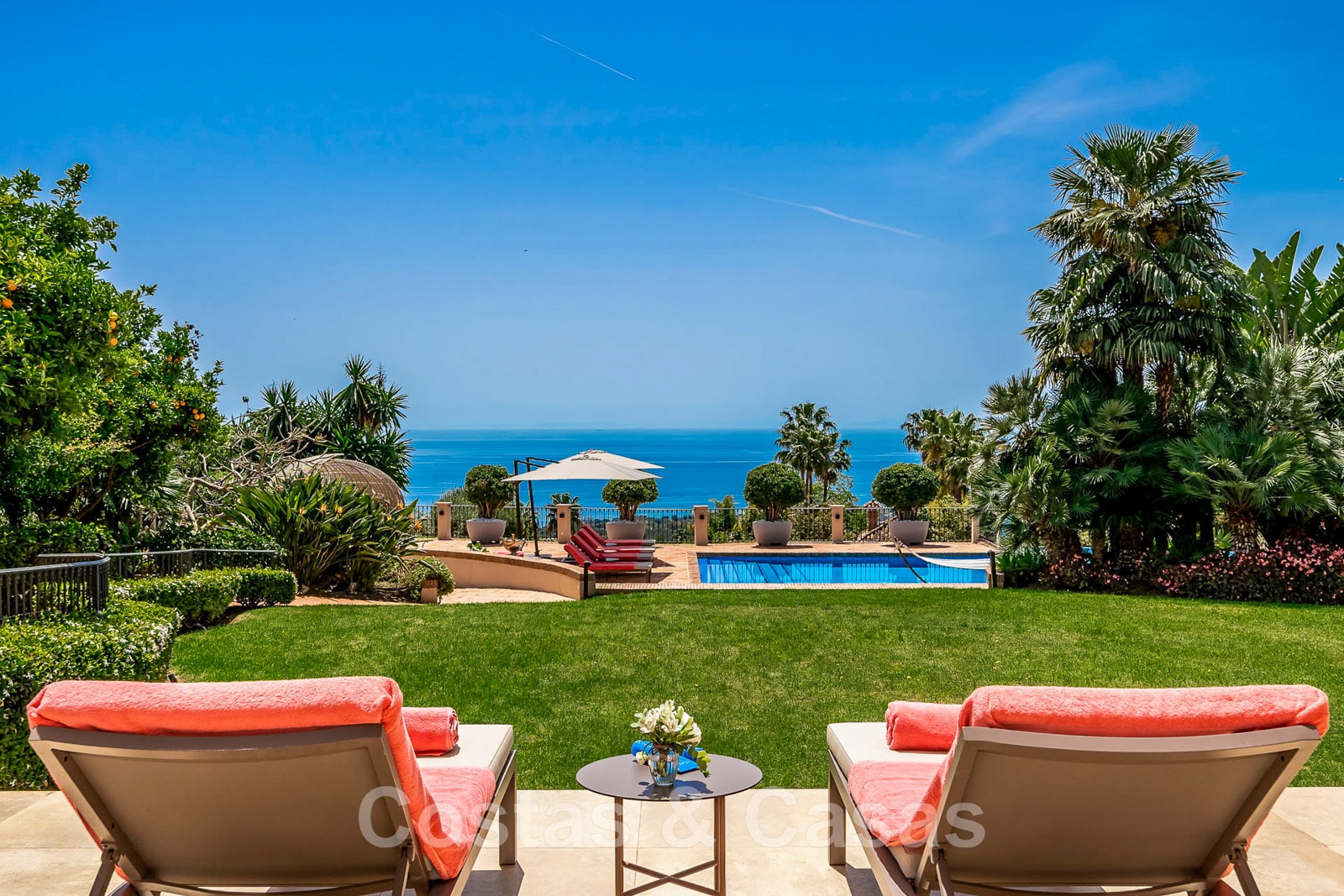 Un large escalier de jardin descendant mène à un vaste solarium avec une piscine à débordement.