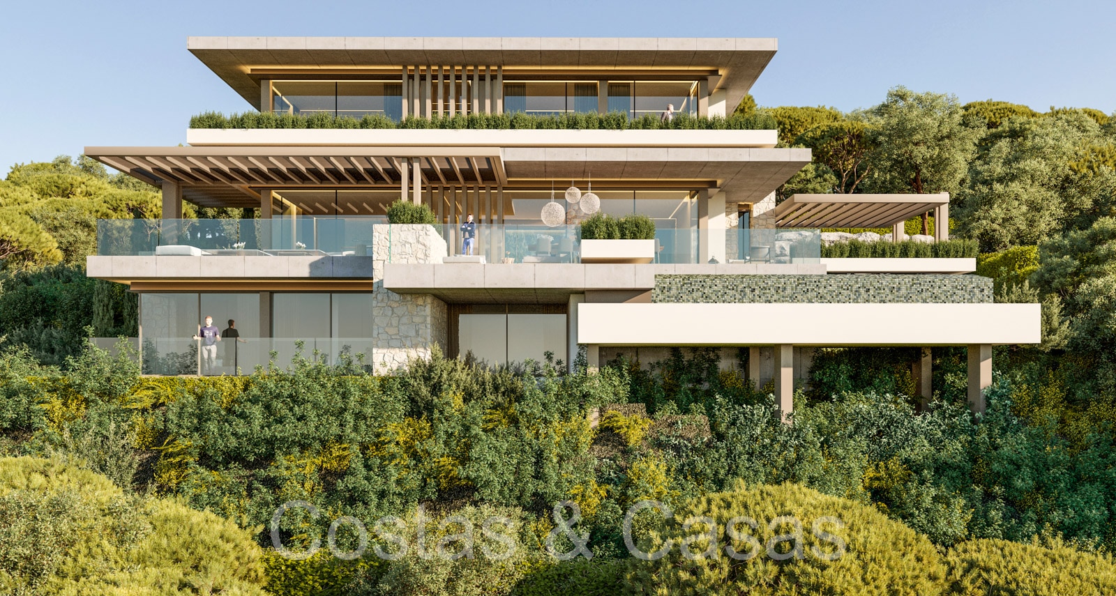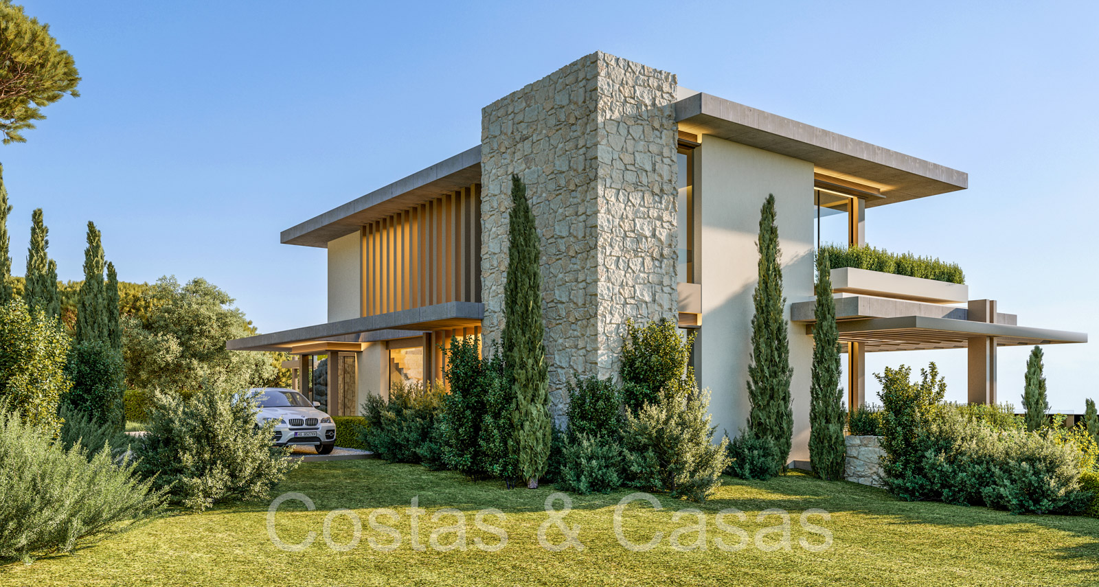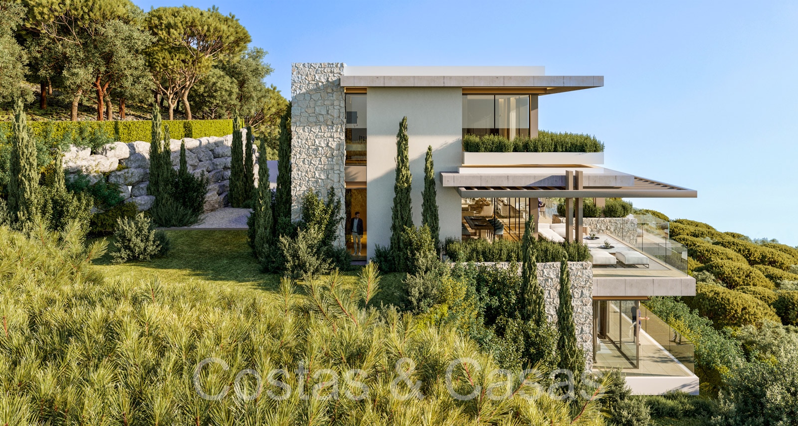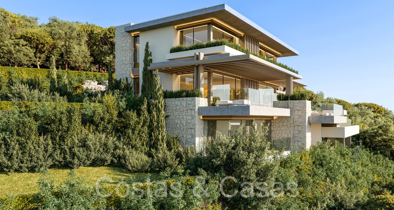 Terrain : 1 281 m² + 8 000 m² Superficie construite : 543m² Superficie des terrasses : 253m² 5 chambres, 5 salles de bains 3 étages n.b. le prix est pour le terrain + le projet. Les coûts de construction sont distincts.