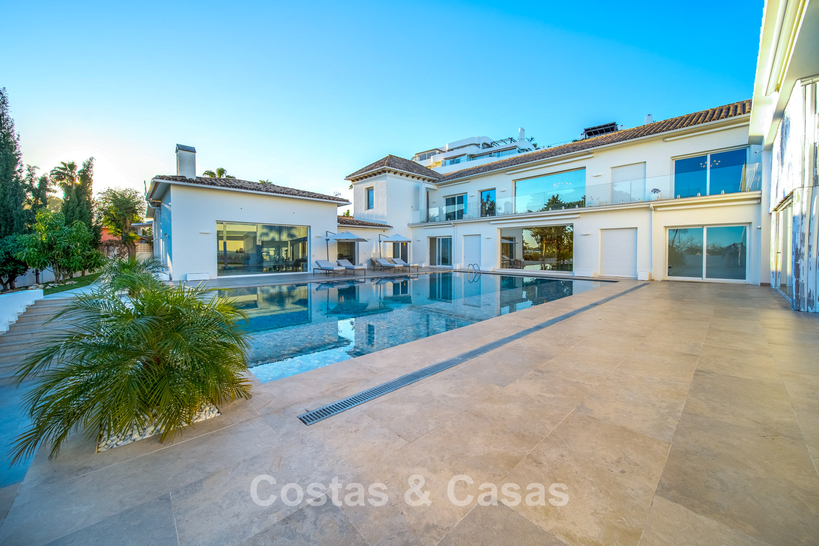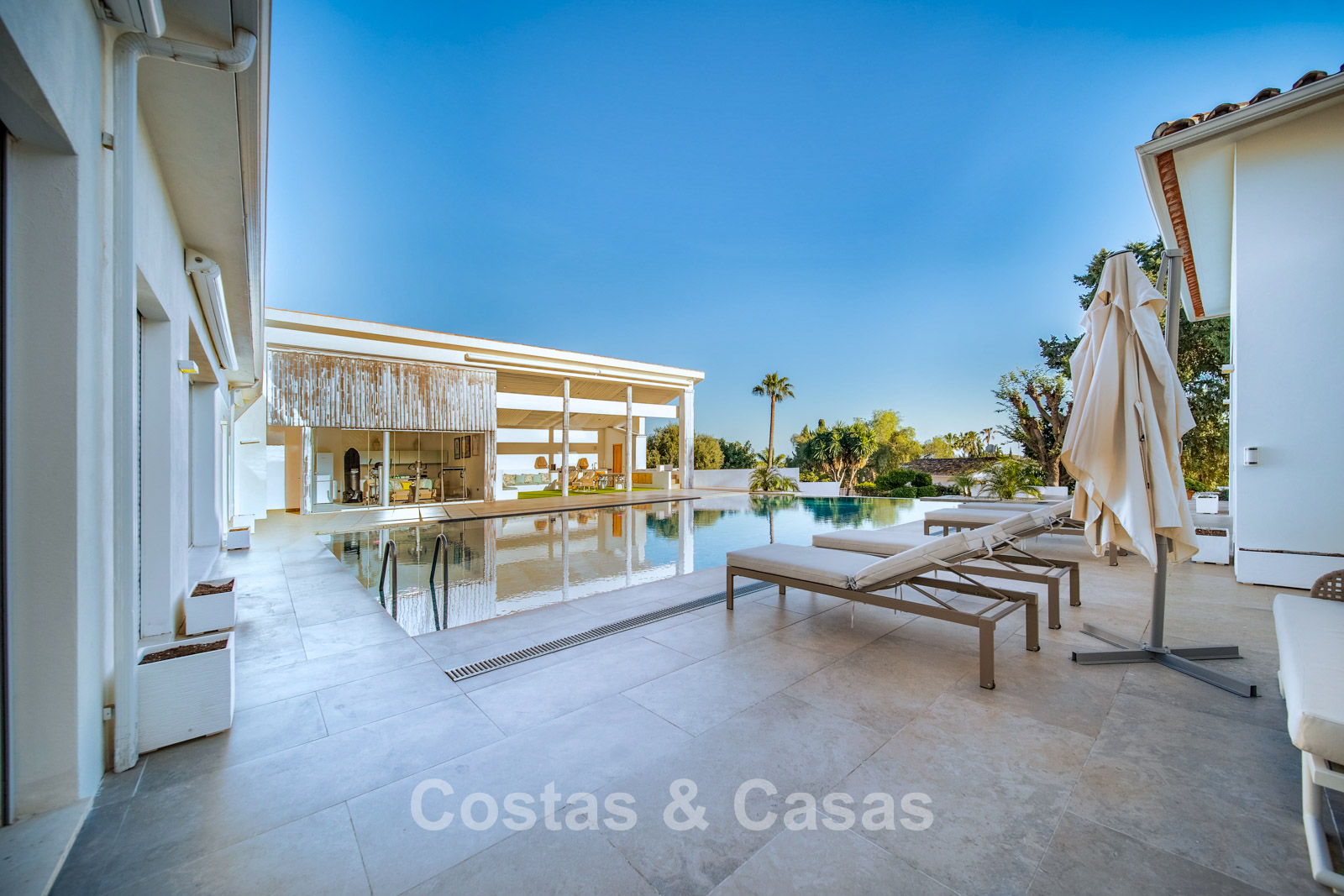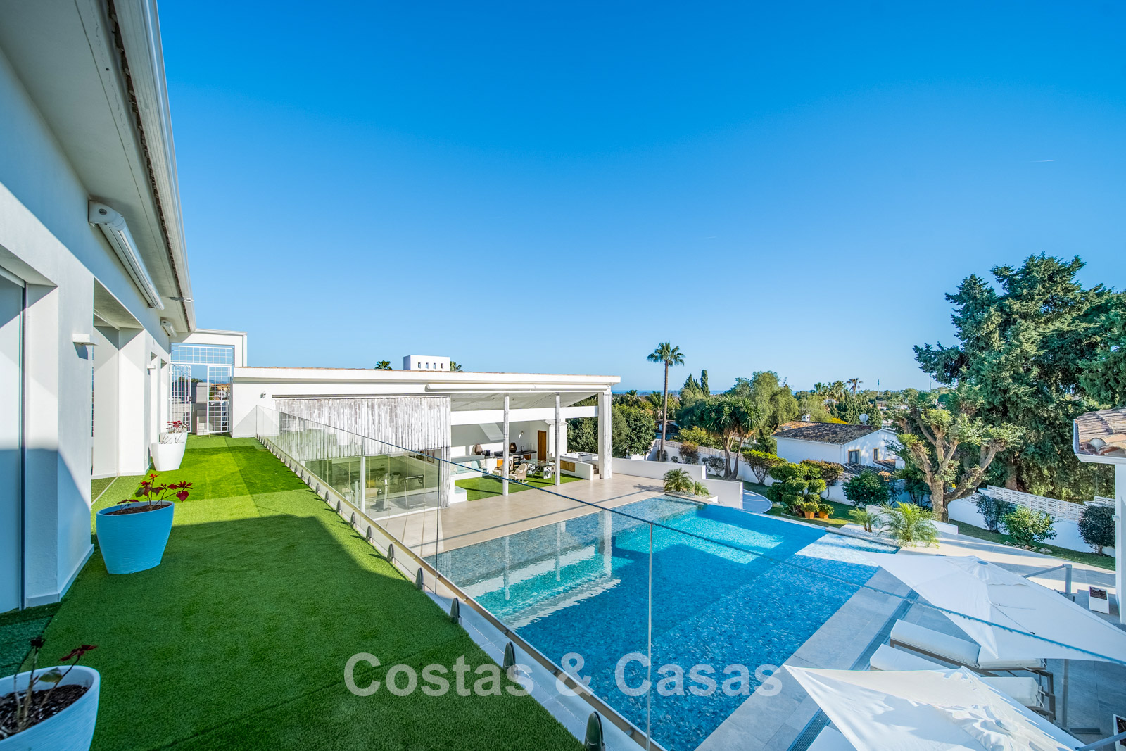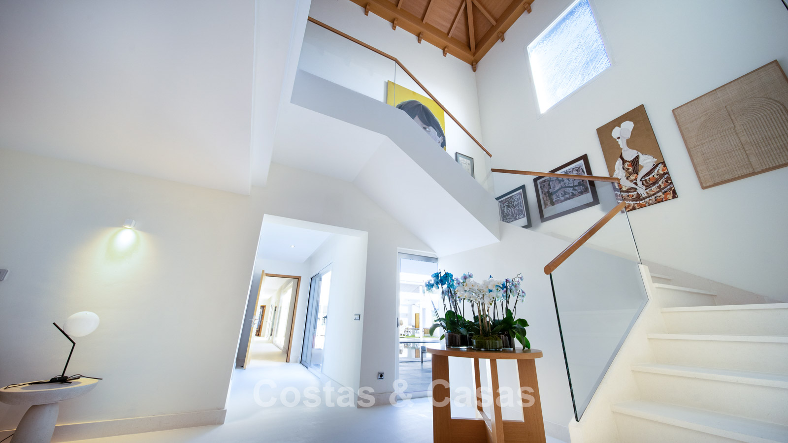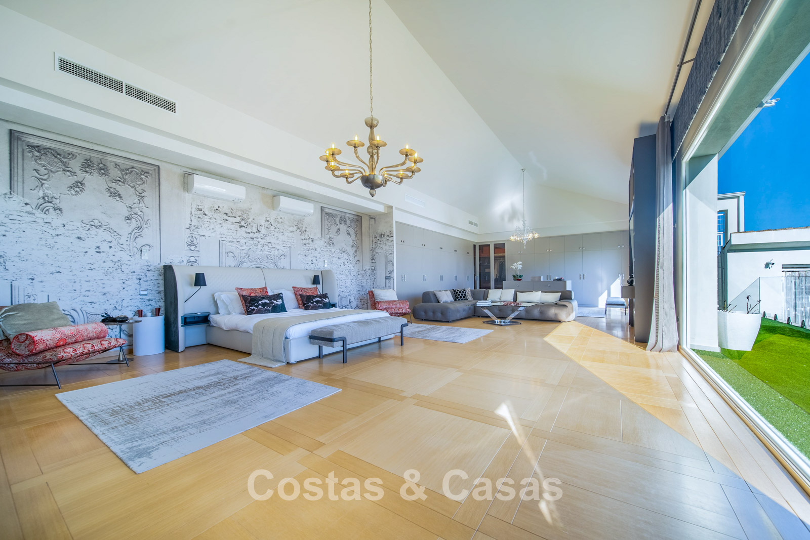 Autres caractéristiques : Climatisation chaud/froid Cheminée Placards intégrés Sols carrelés de qualité Double vitrage Garde-corps en verre Éclairage LED intérieur et extérieur Stores motorisés