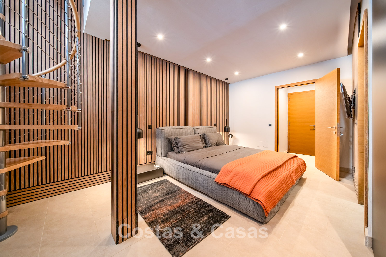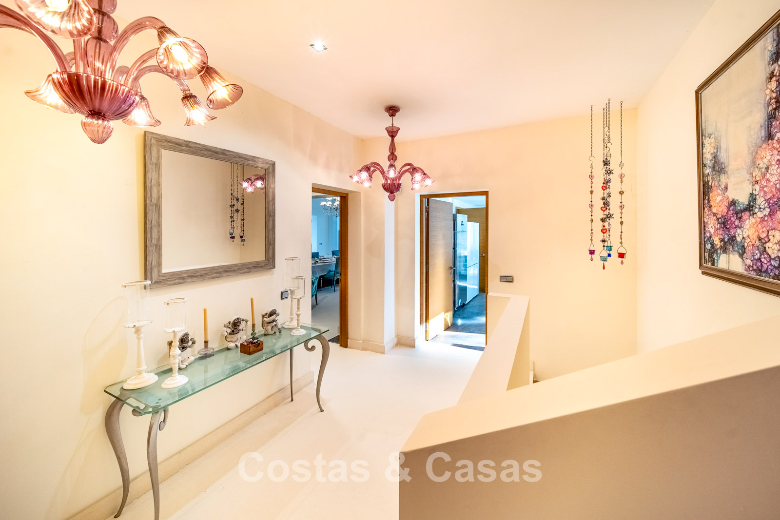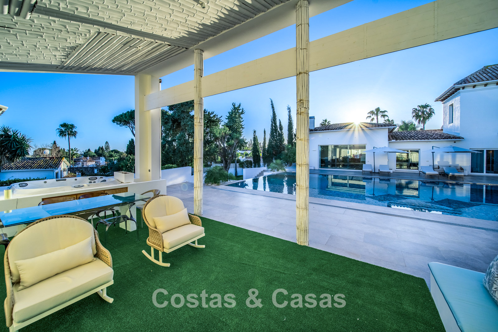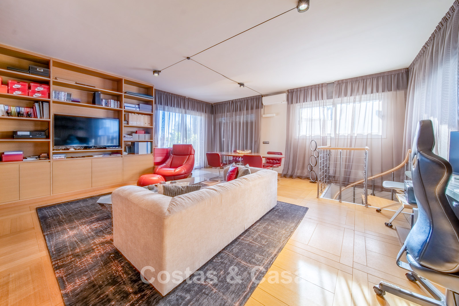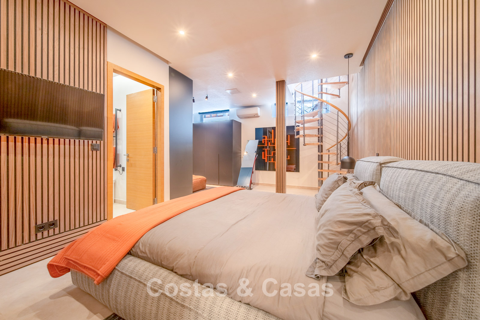Autres caractéristiques : Climatisation chaud/froid Cheminée Placards intégrés Sols carrelés de qualité Double vitrage Garde-corps en verre Éclairage LED intérieur et extérieur Stores motorisés