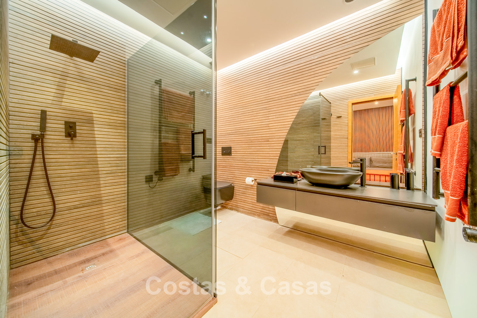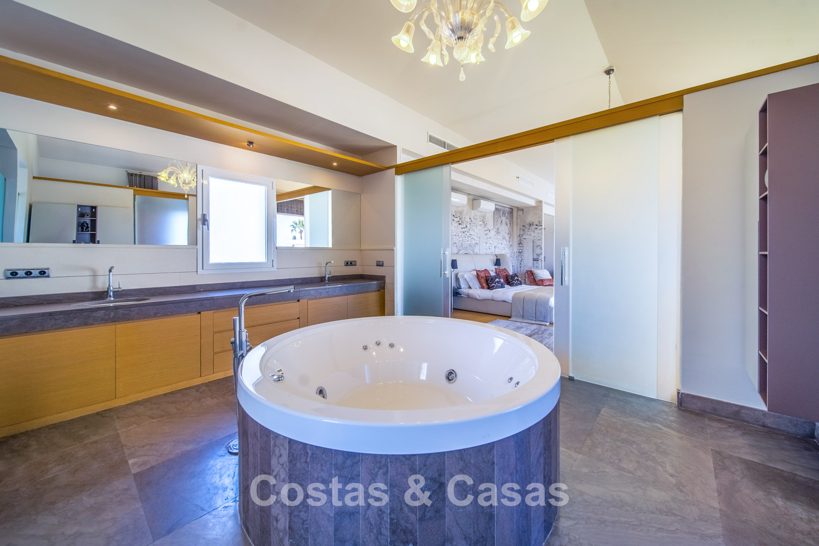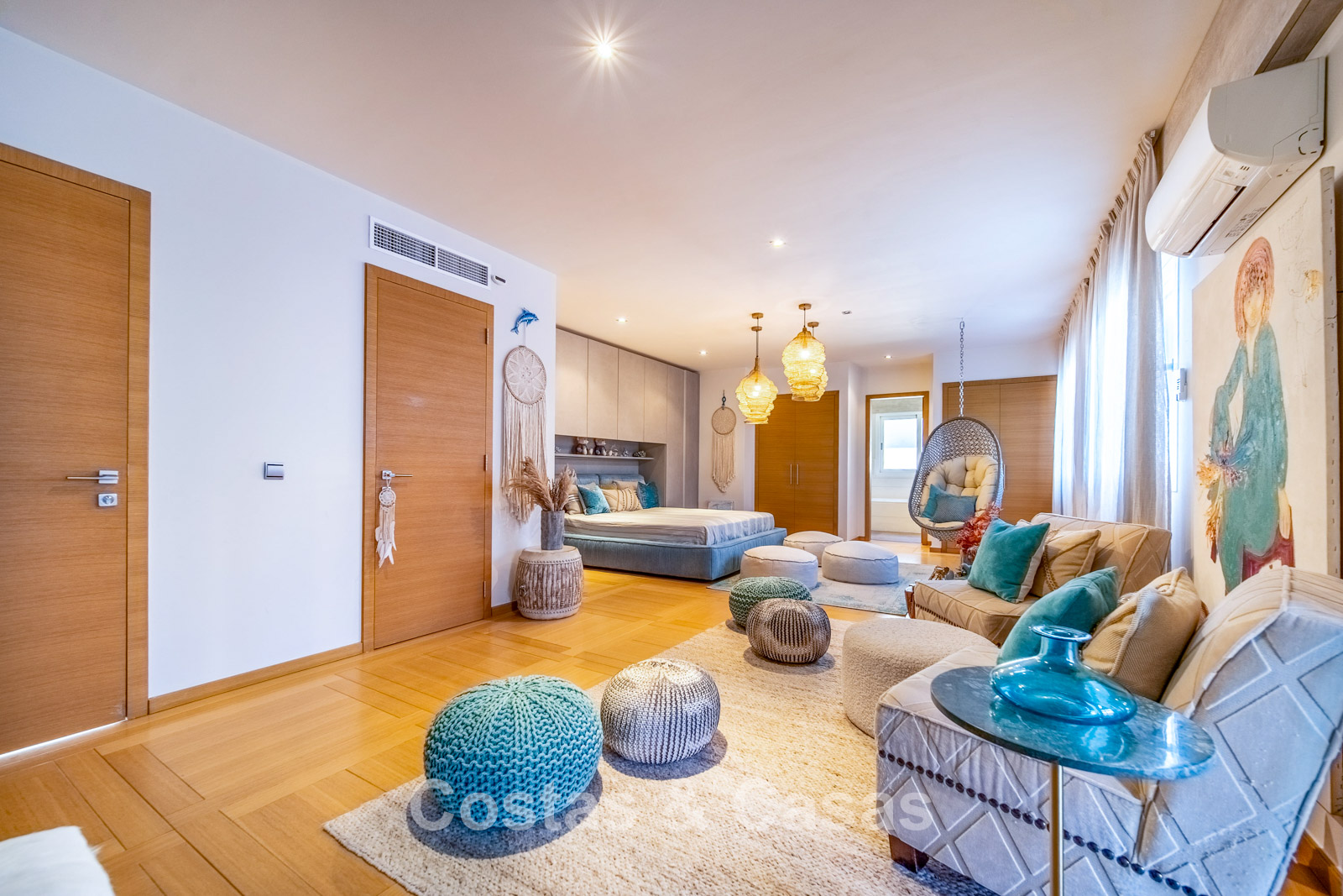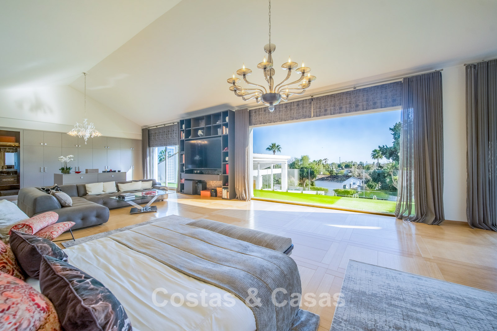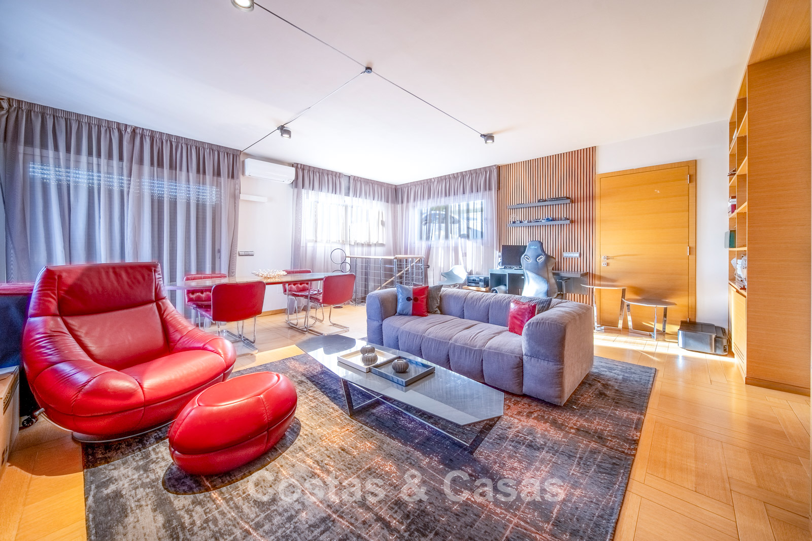 Autres caractéristiques : Climatisation chaud/froid Cheminée Placards intégrés Sols carrelés de qualité Double vitrage Garde-corps en verre Éclairage LED intérieur et extérieur Stores motorisés