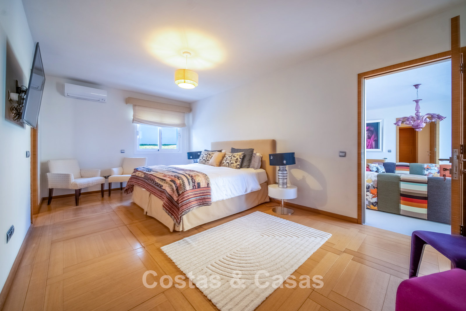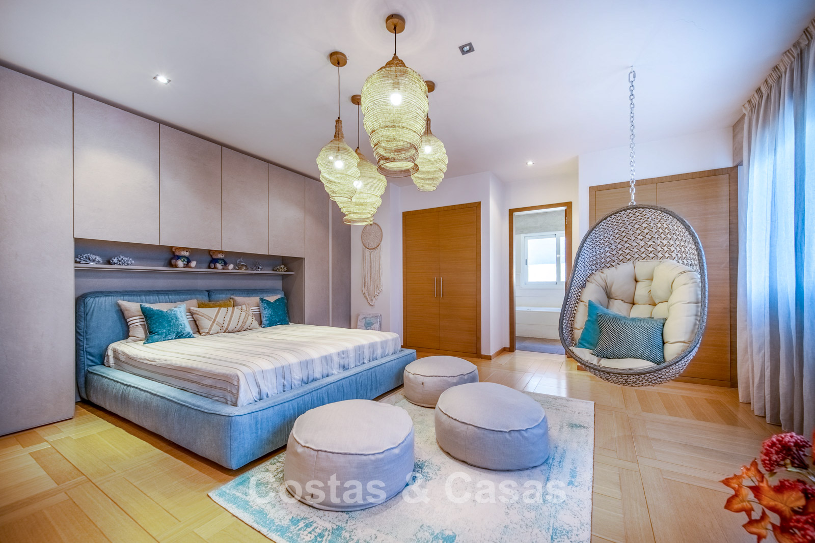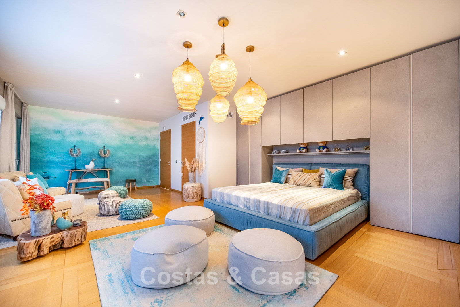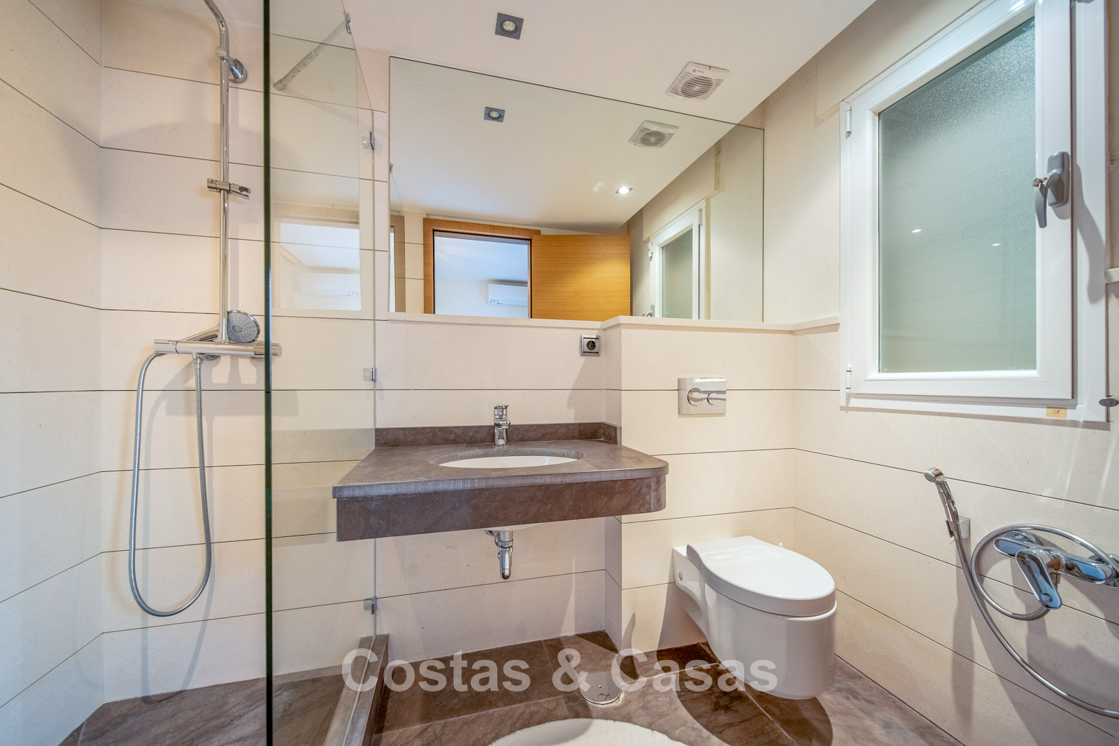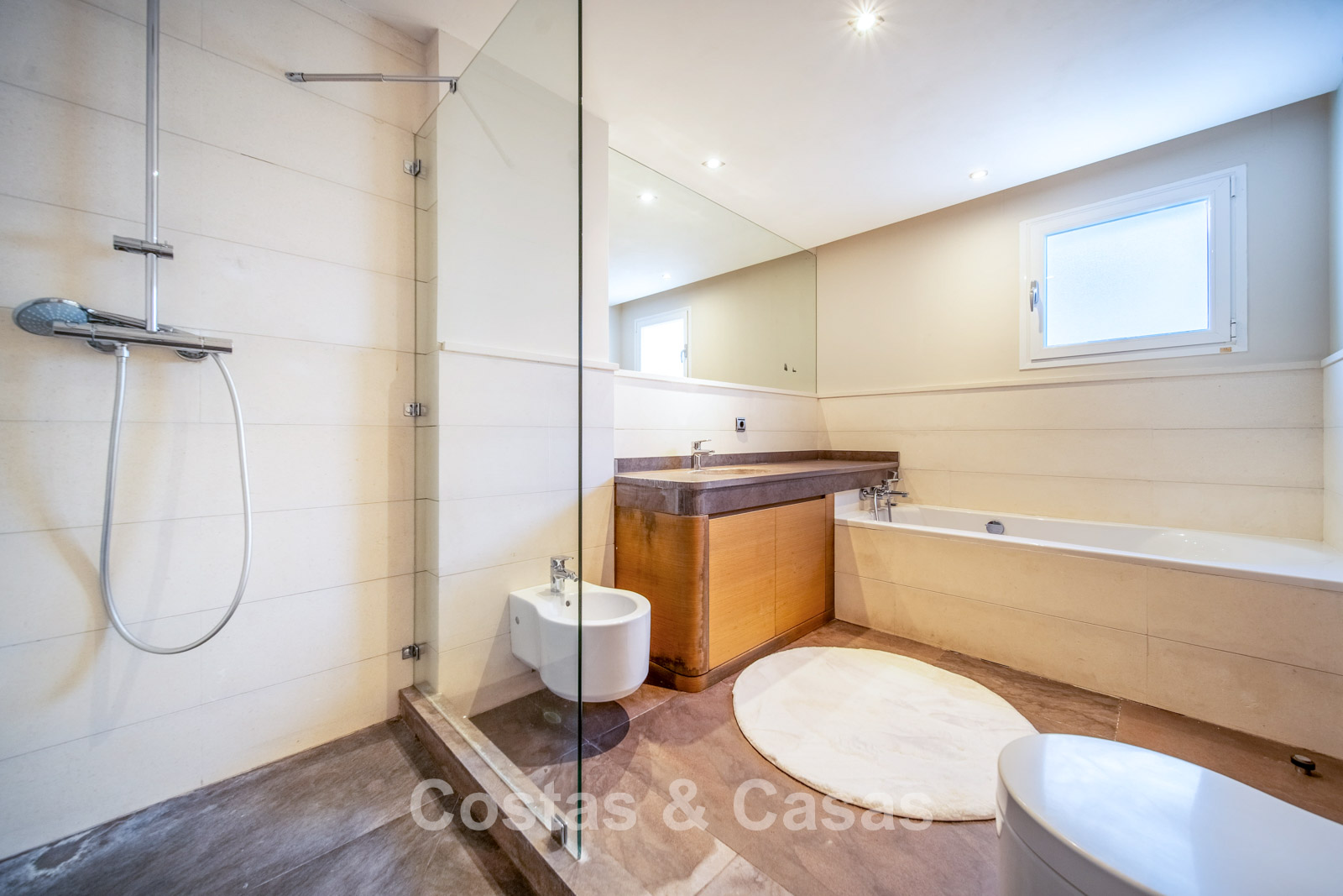 Autres caractéristiques : Climatisation chaud/froid Cheminée Placards intégrés Sols carrelés de qualité Double vitrage Garde-corps en verre Éclairage LED intérieur et extérieur Stores motorisés