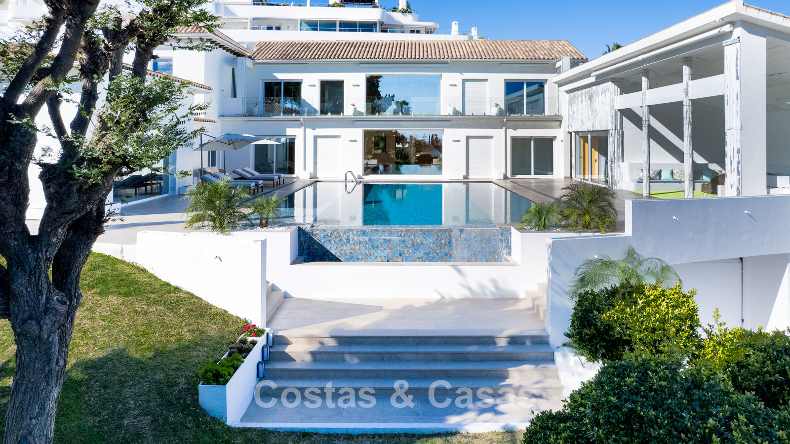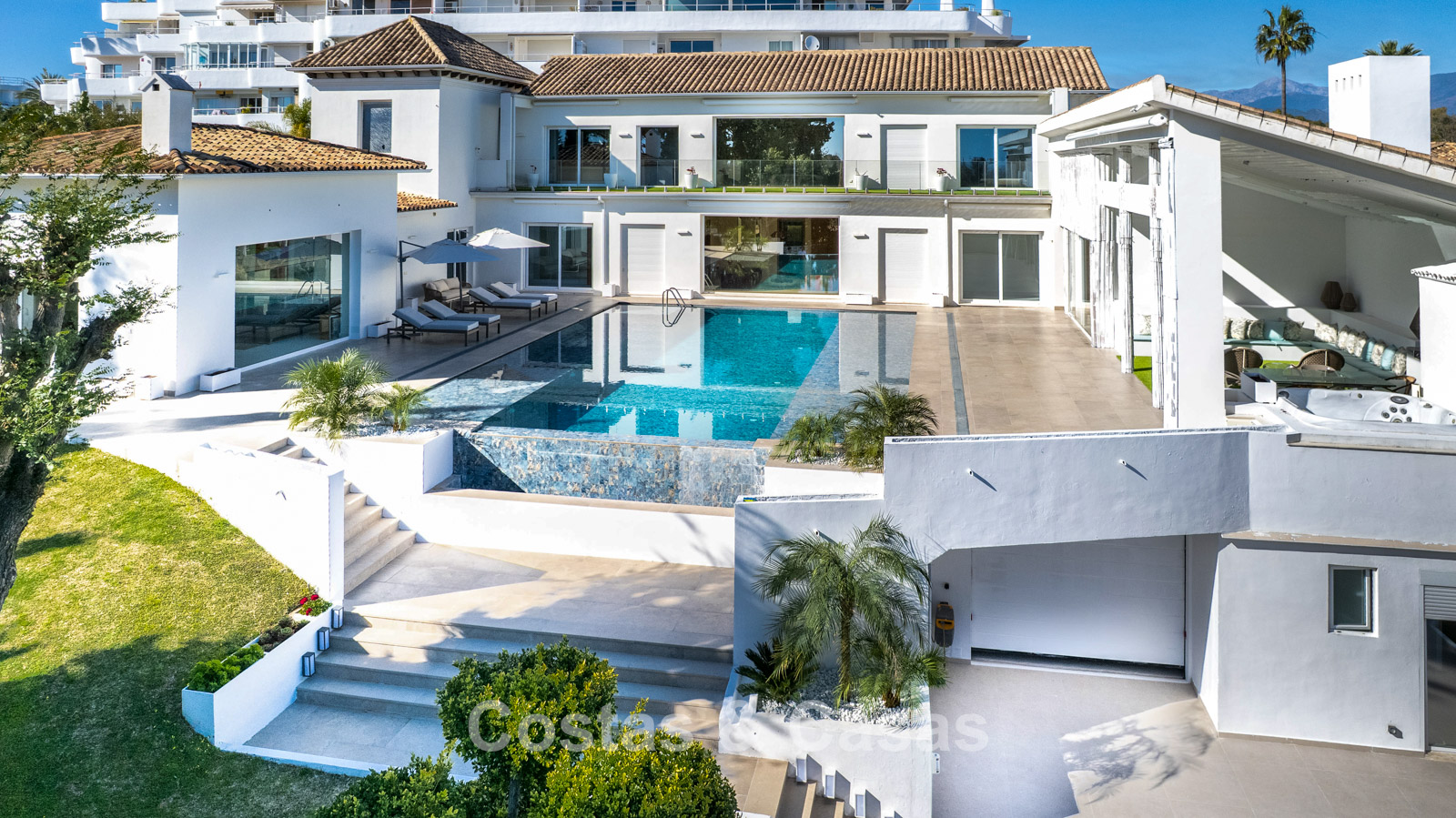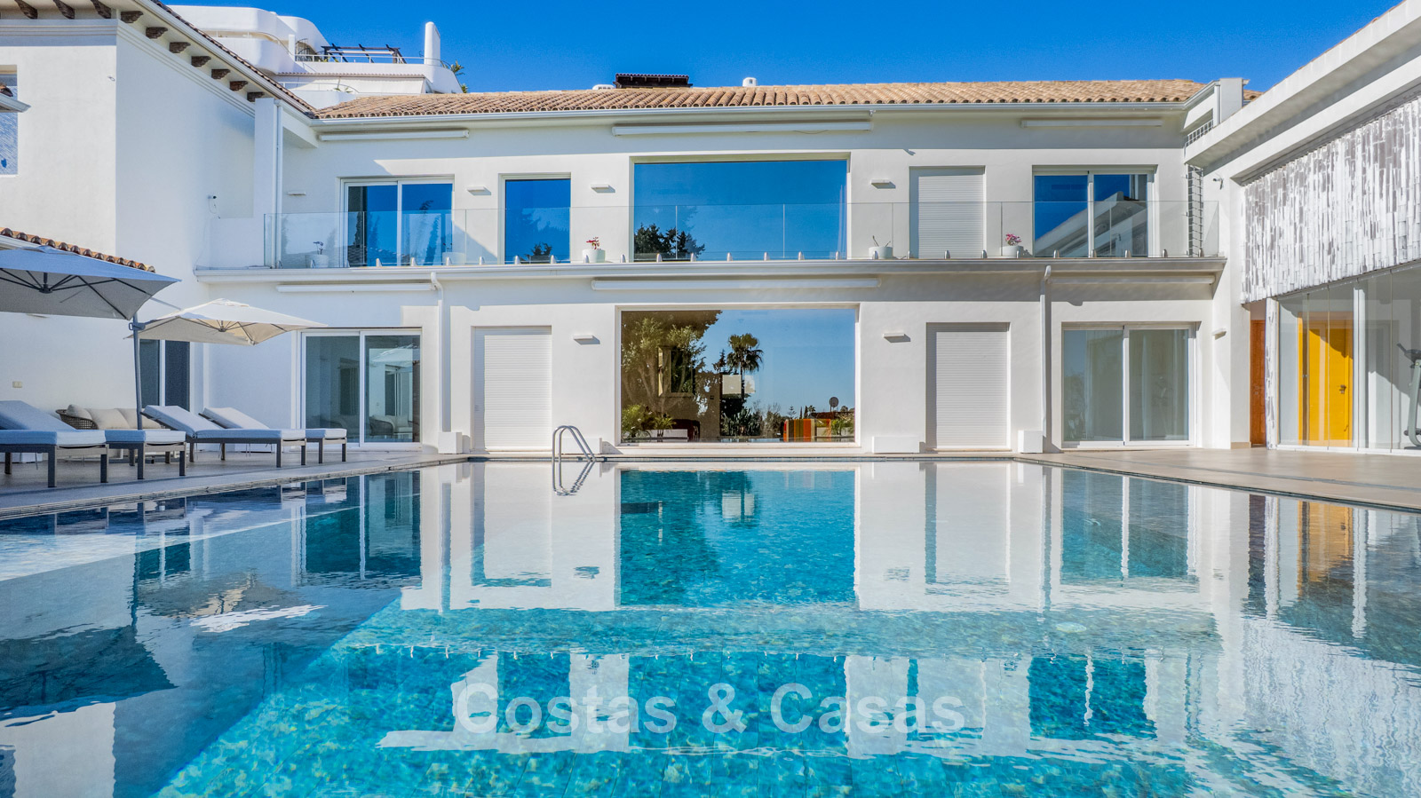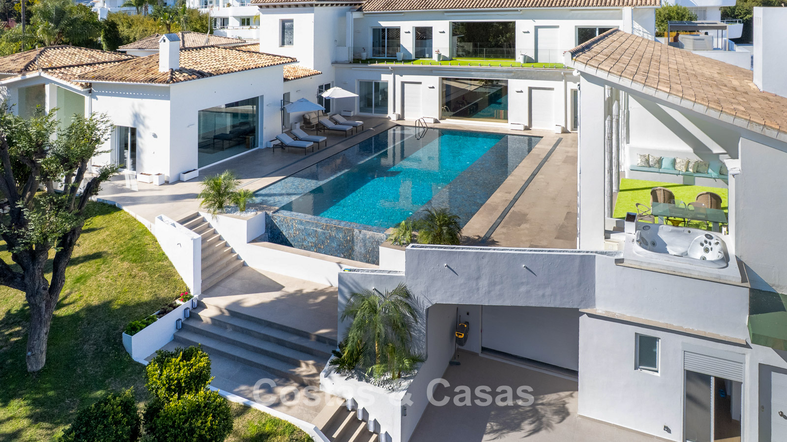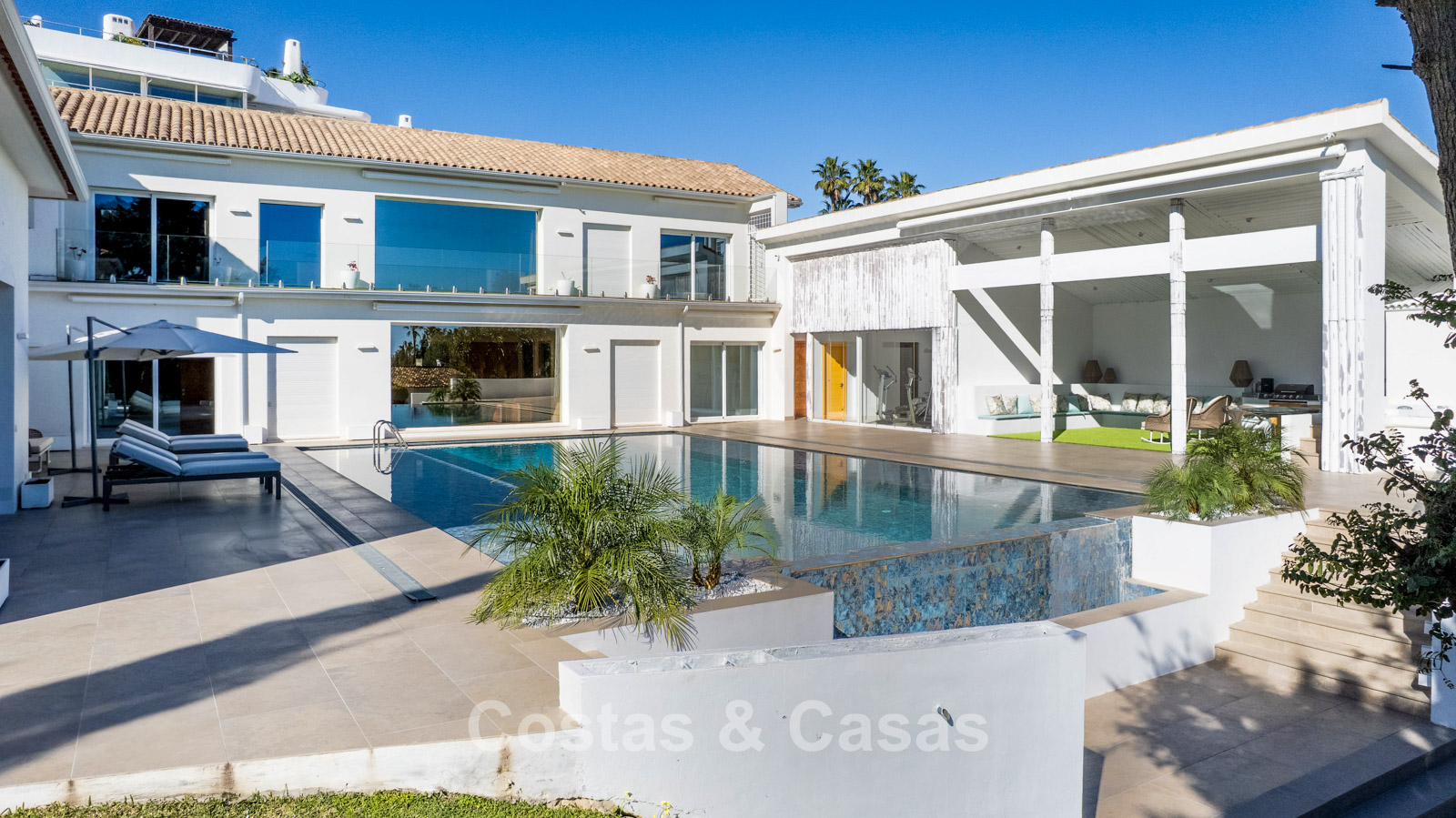 Villa spacieuse et bien conçue, entièrement rénovée en 2025. Matériaux de haute qualité et finitions haut de gamme. Intérieur lumineux grâce à de grandes baies vitrées et une disposition ouverte. Grand espace de vie avec plusieurs salons. Cuisine moderne entièrement équipée avec îlot central. Cuisine secondaire "dirty kitchen". Salle à manger formelle avec plafond à poutres apparentes. 6 chambres avec salles de bains en suite et 2 toilettes invités. Étage supérieur entièrement dédié aux propriétaires avec suite parentale, salon, dressing et terrasse avec jacuzzi. Rez-de-chaussée avec espaces supplémentaires modulables. Logement indépendant pour invités ou personnel. Bureau ou salle multimédia. Salle de sport entièrement équipée. Garage privé pour plus de 3 voitures et stationnement supplémentaire.