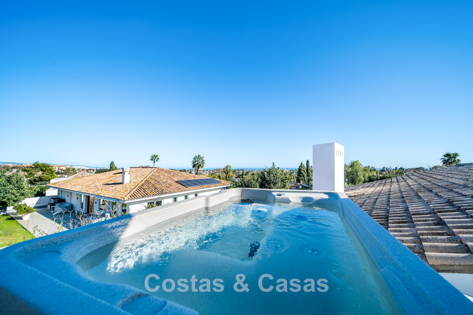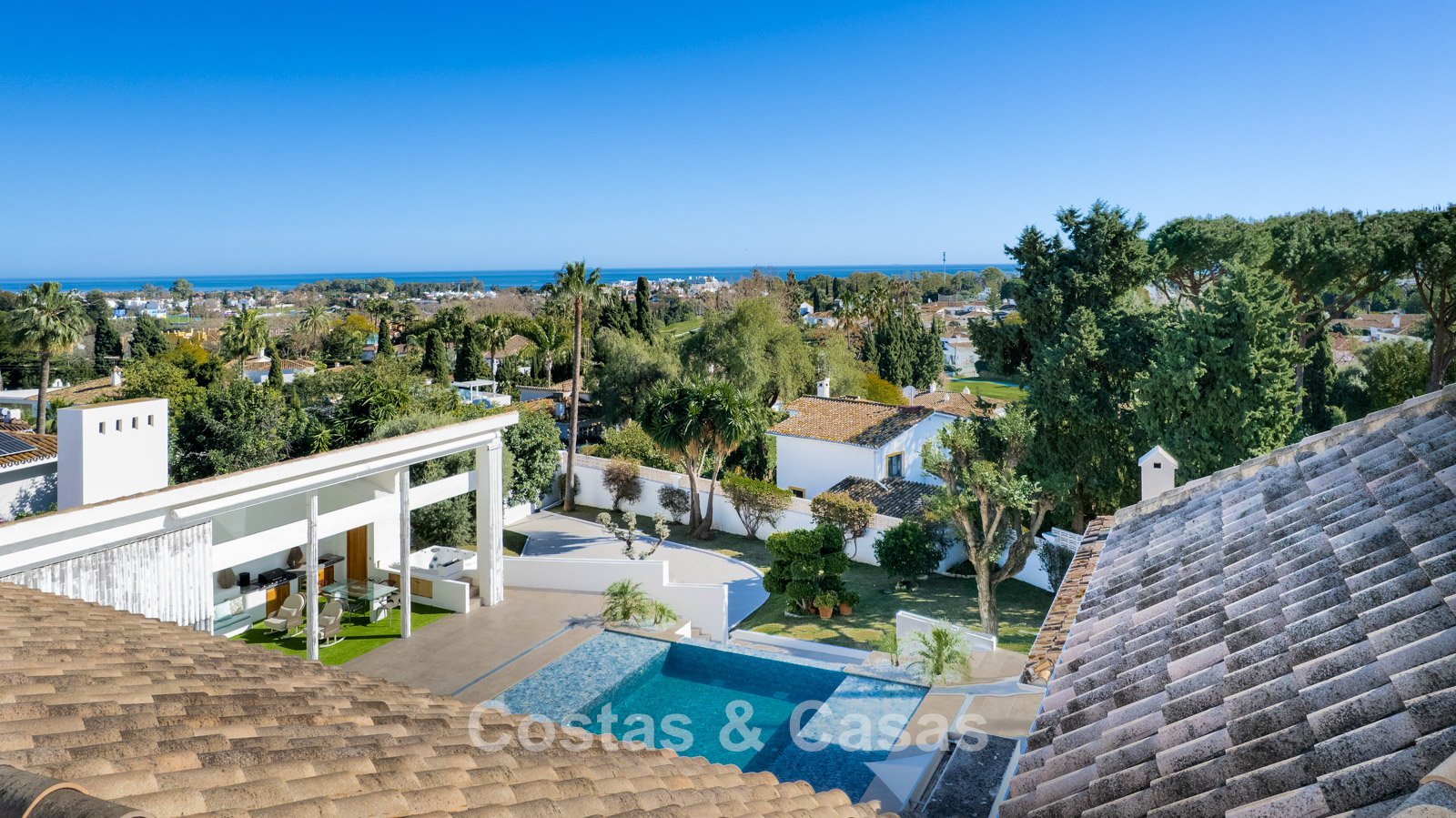 Grand terrain mature avec double accès. Jardin paysager entourant toute la villa. Grande piscine à débordement avec jacuzzi, terrasse couverte, cuisine extérieure et espace détente. Orientation plein sud pour une luminosité maximale. Vue panoramique sur le golf et vue mer depuis l’étage supérieur.