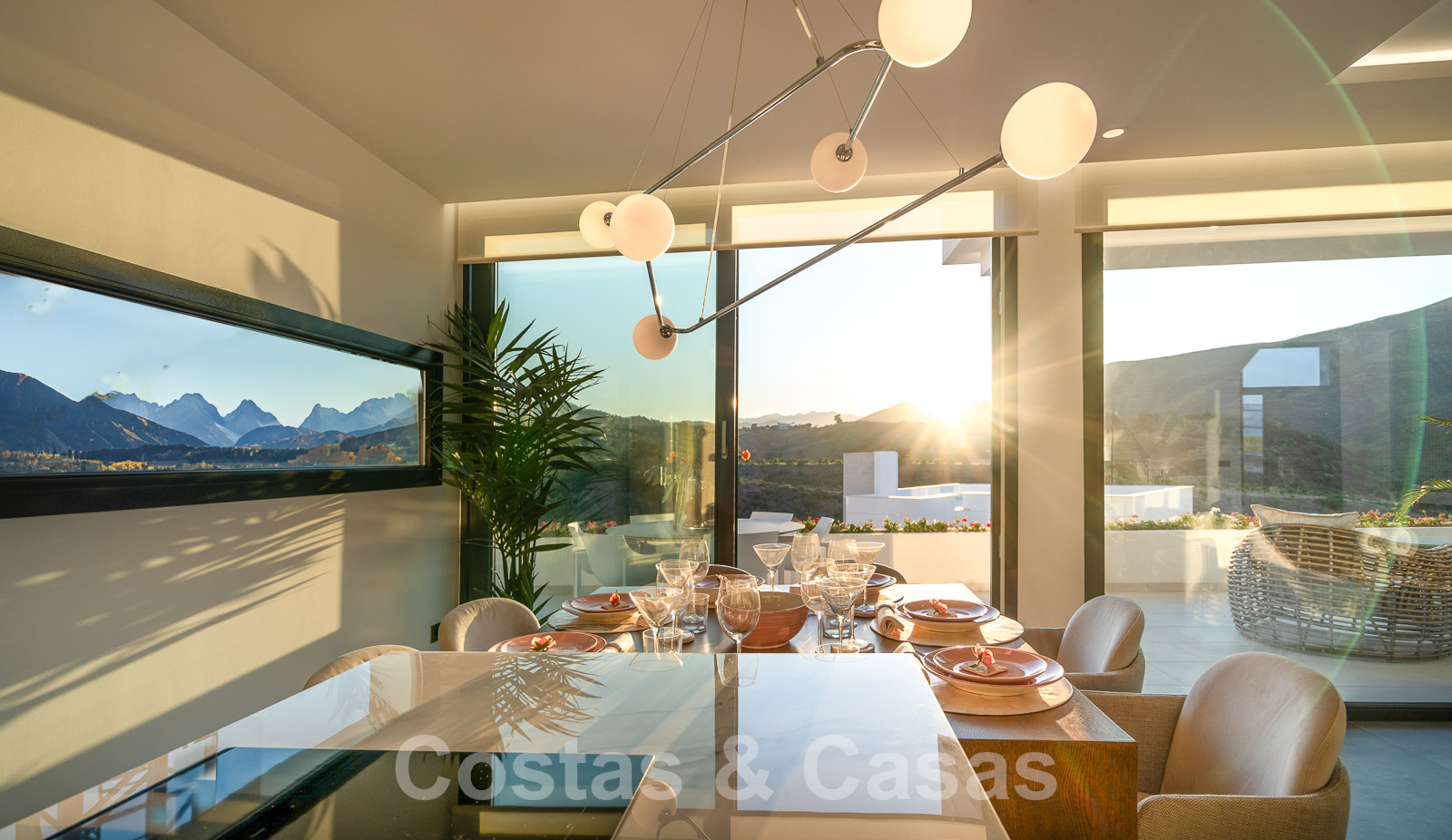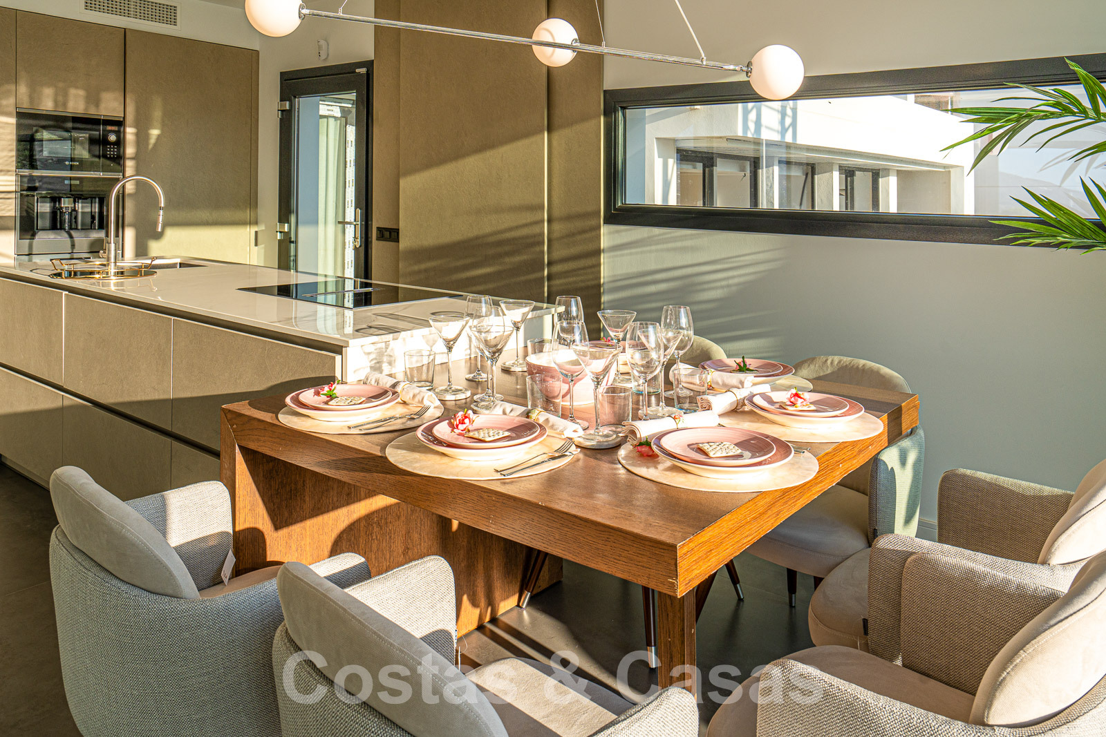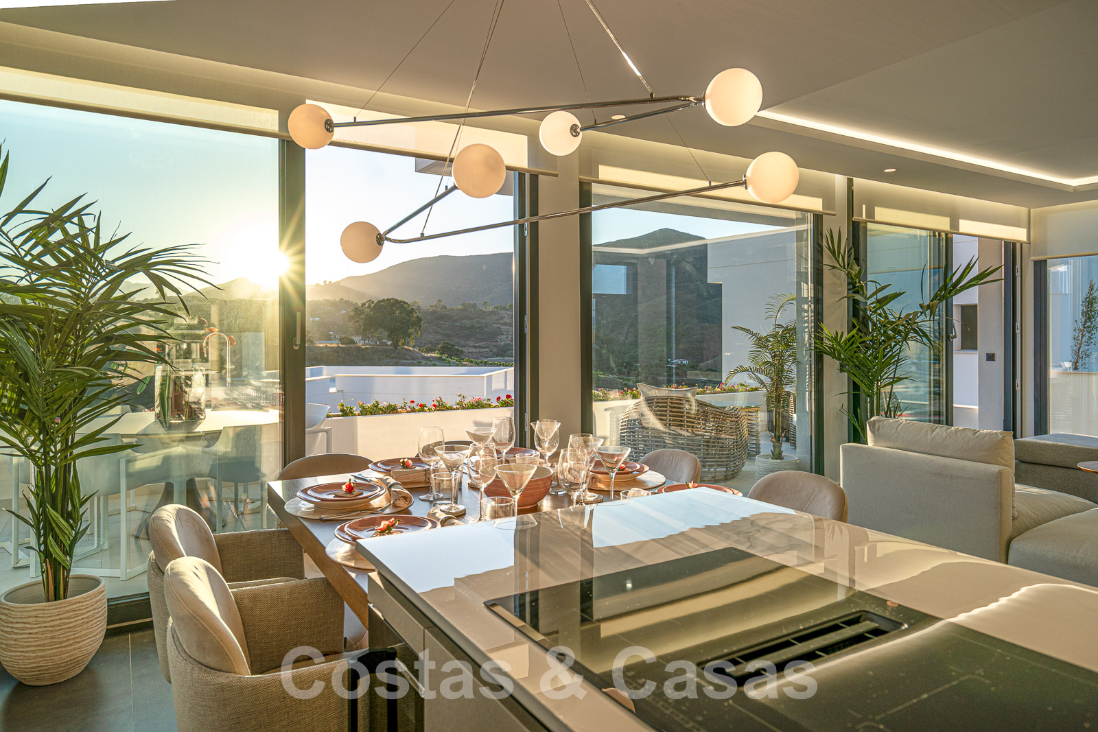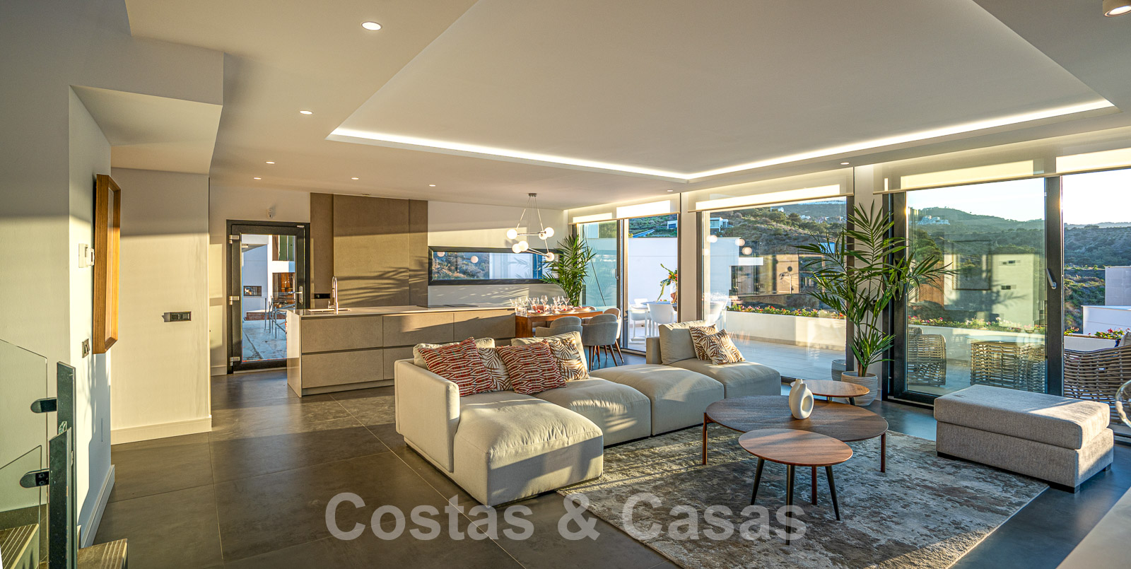 Cuisine ouverte, coin repas et salon avec accès direct aux terrasses et à la piscine.