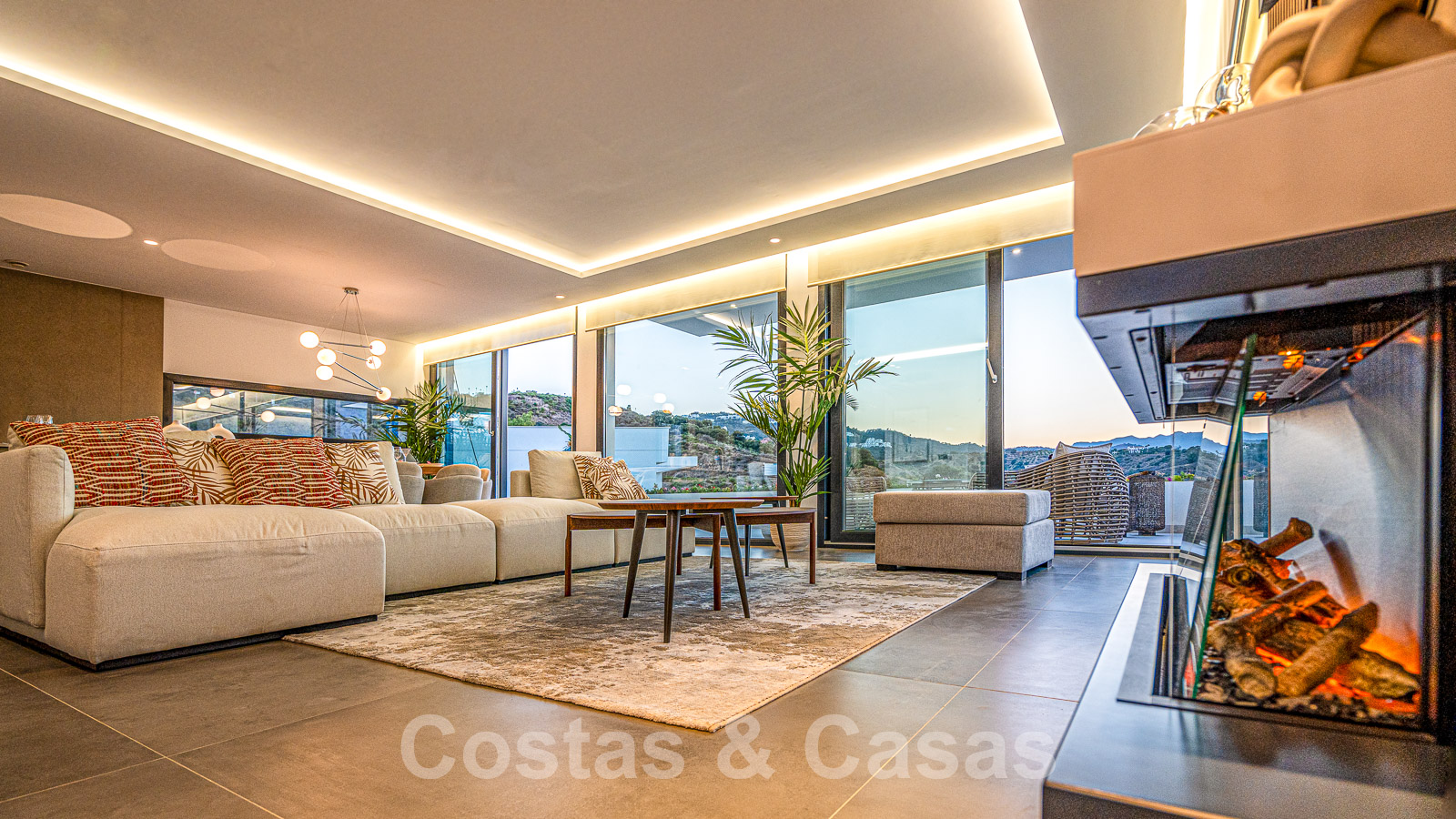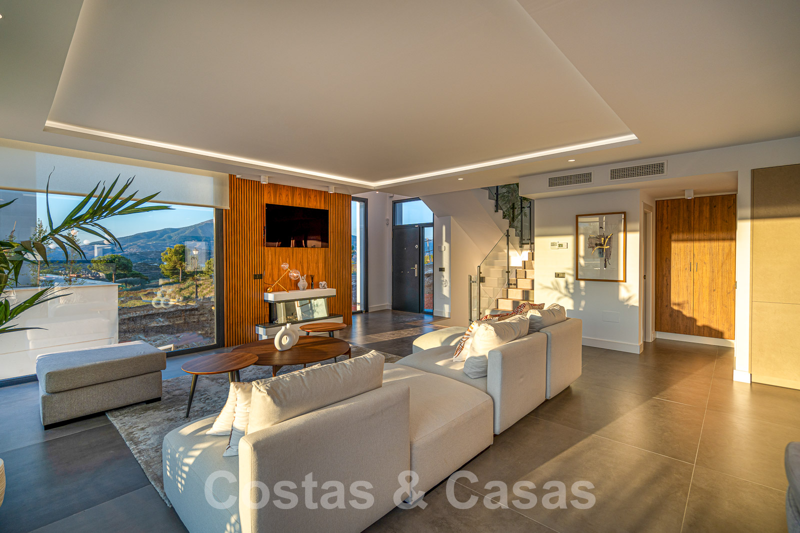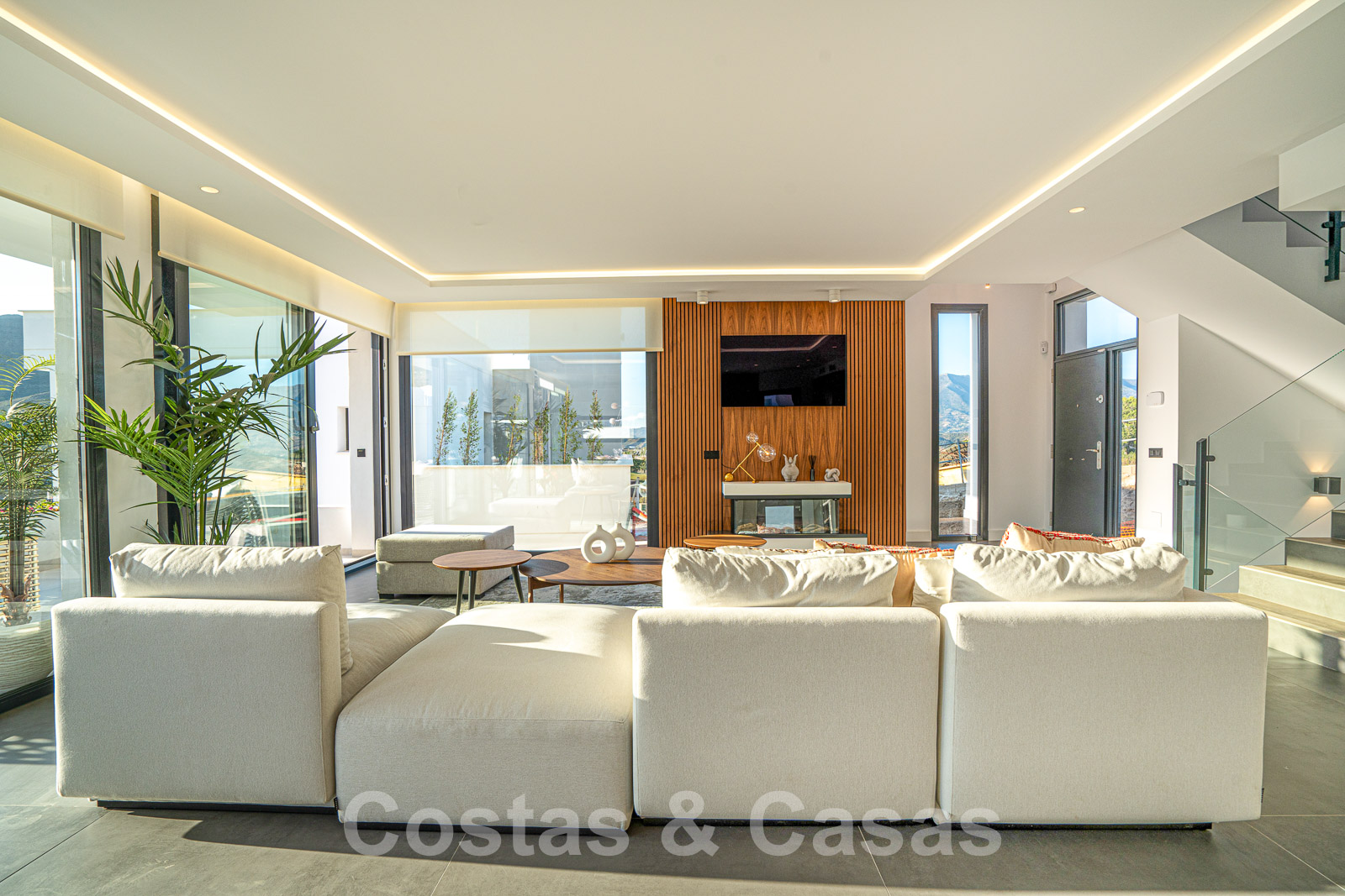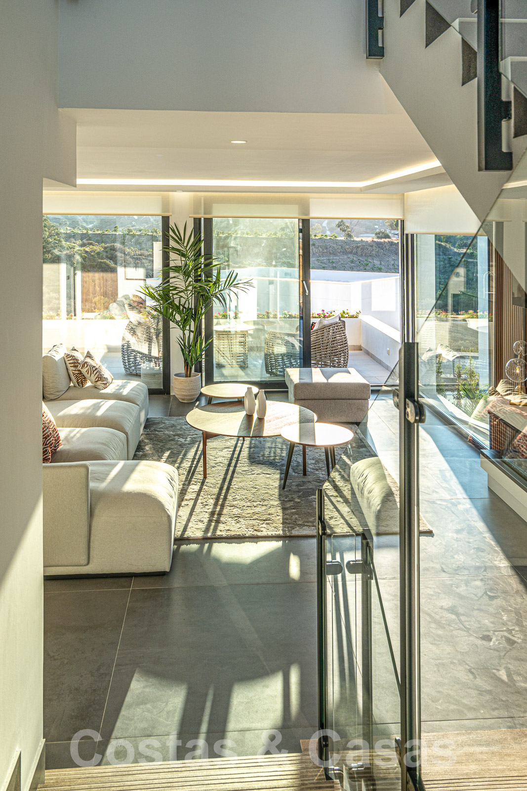 Cuisine ouverte, coin repas et salon avec accès direct aux terrasses et à la piscine.