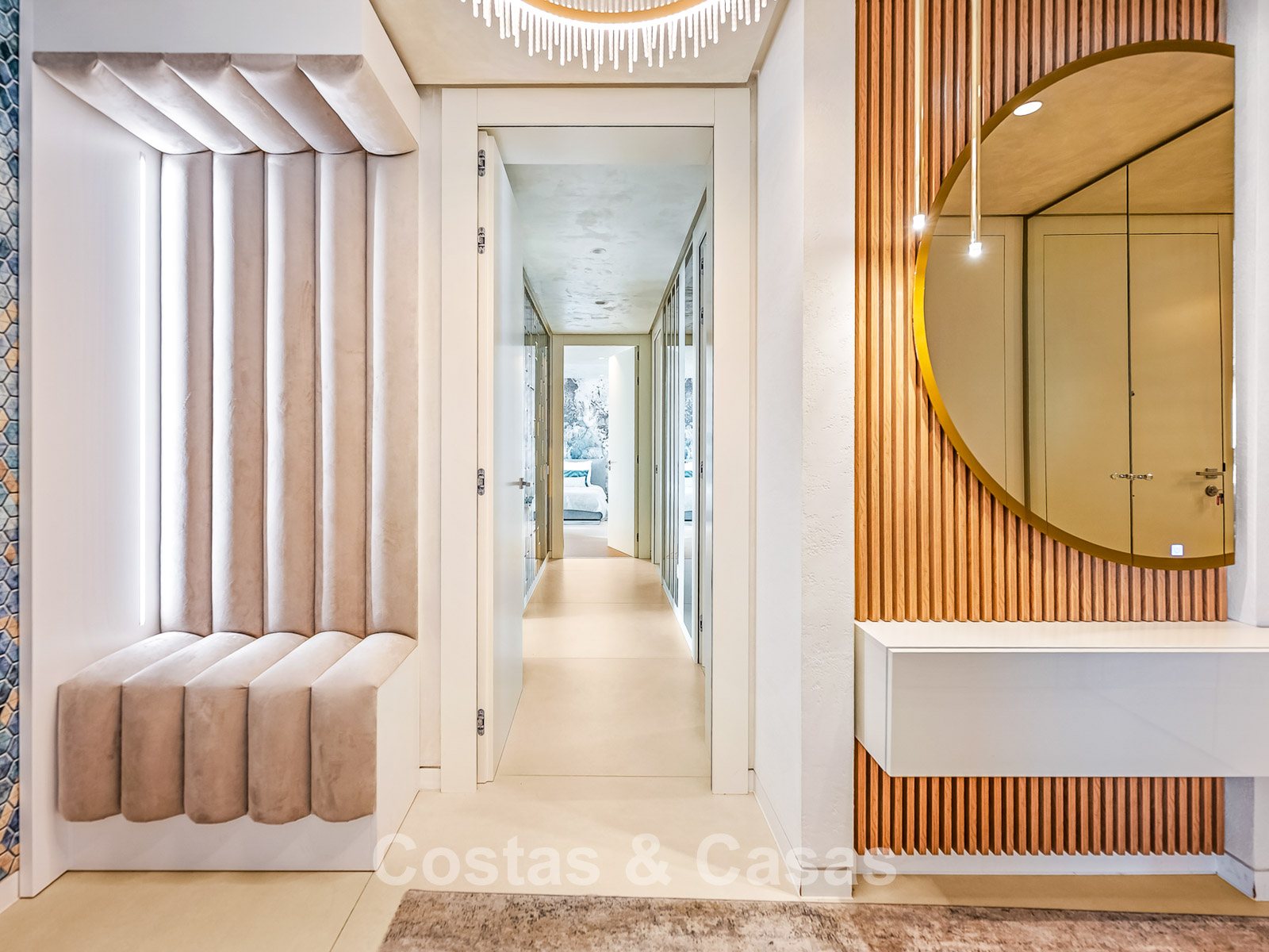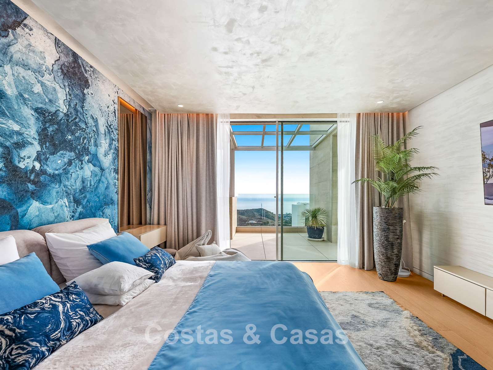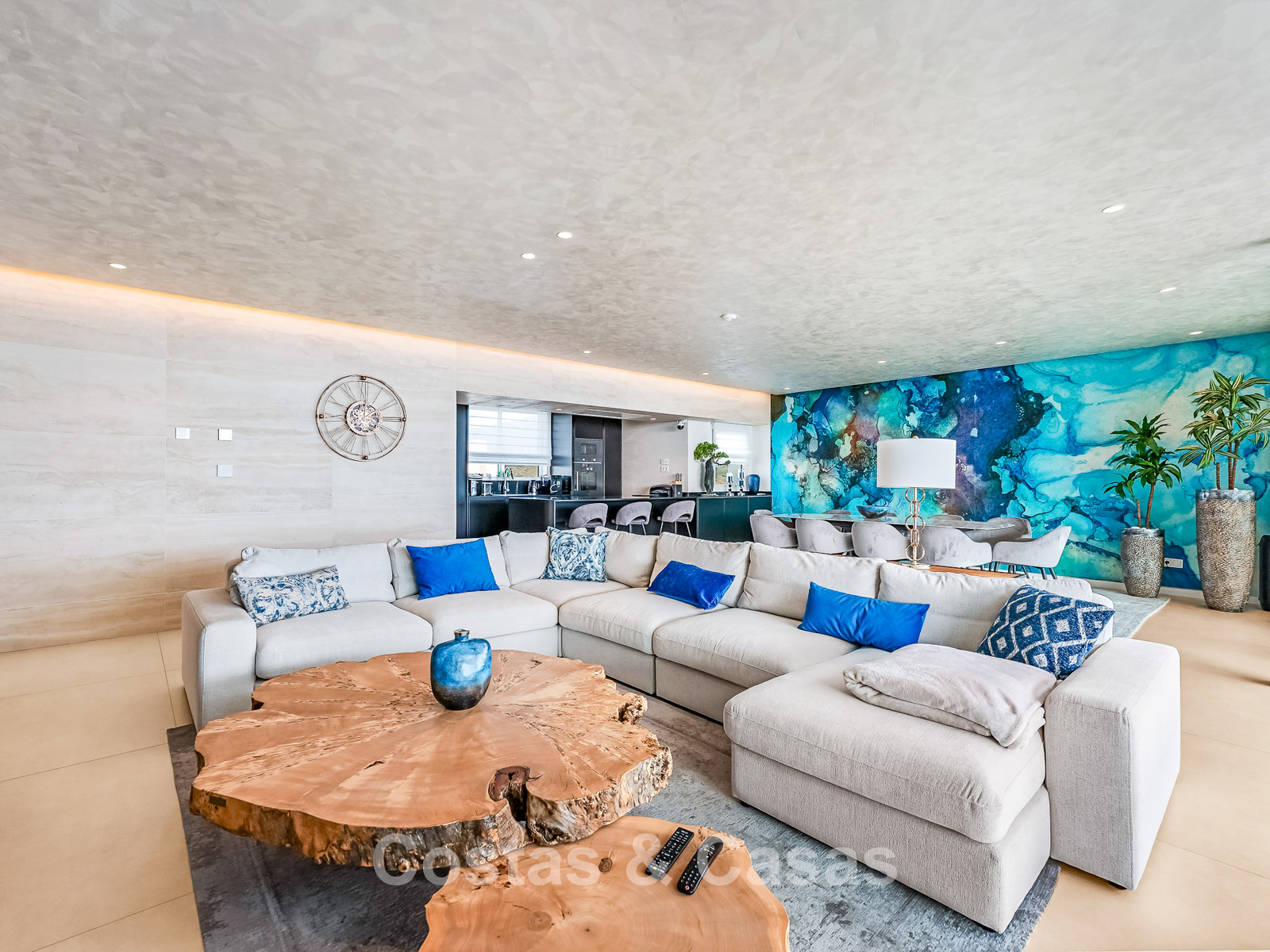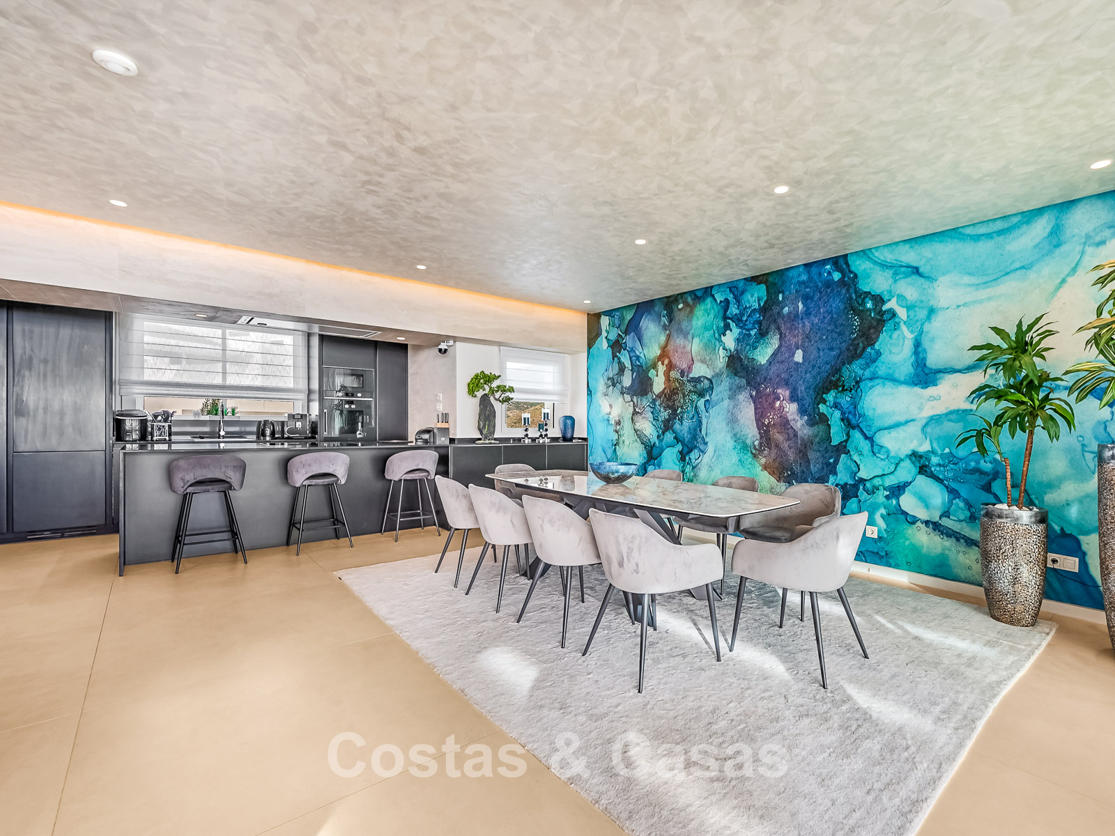 Penthouse exceptionnel en parfait état avec les améliorations les plus luxueuses. Faisant partie d’une communauté boutique de seulement 20 appartements, dont 4 penthouses, au sein d’un développement exclusif. Construit avec des matériaux de haute qualité et une finition soignée. Orientation sud idéale. Depuis presque tous les points de la propriété, profitez de vues panoramiques supérieures et dégagées sur les collines verdoyantes et la mer. L’extérieur est spectaculaire avec une terrasse “wrap-around” et un immense solarium au dernier étage. La terrasse sur le toit est une oasis privée avec jacuzzi, cuisine extérieure Miele entièrement équipée et douche. Adjacente aux espaces de vie et de cuisine, une pergola bioclimatique, totalement ouverte ou fermée, permet de profiter toute l’année. De grandes baies vitrées coulissantes assurent une transition parfaite entre intérieur et extérieur, les profils encastrés accentuant la sensation d’espace. L’espace de vie comprend un vaste salon et salle à manger en open-plan directement reliés aux terrasses. La cuisine design est une œuvre de Gunni & Trentino, équipée d’appareils Gaggenau haut de gamme. Trois chambres élégantes avec salle de bain en suite, plus une toilette invités supplémentaire. Comprend un grand local de rangement privé. Parking privé souterrain pour 2 voitures.